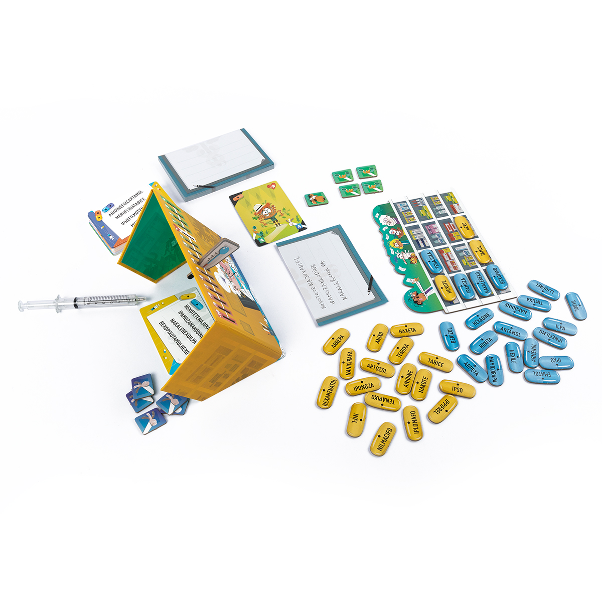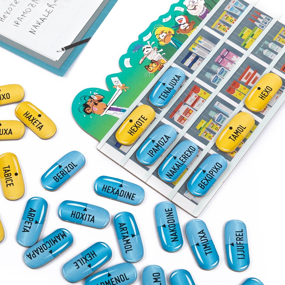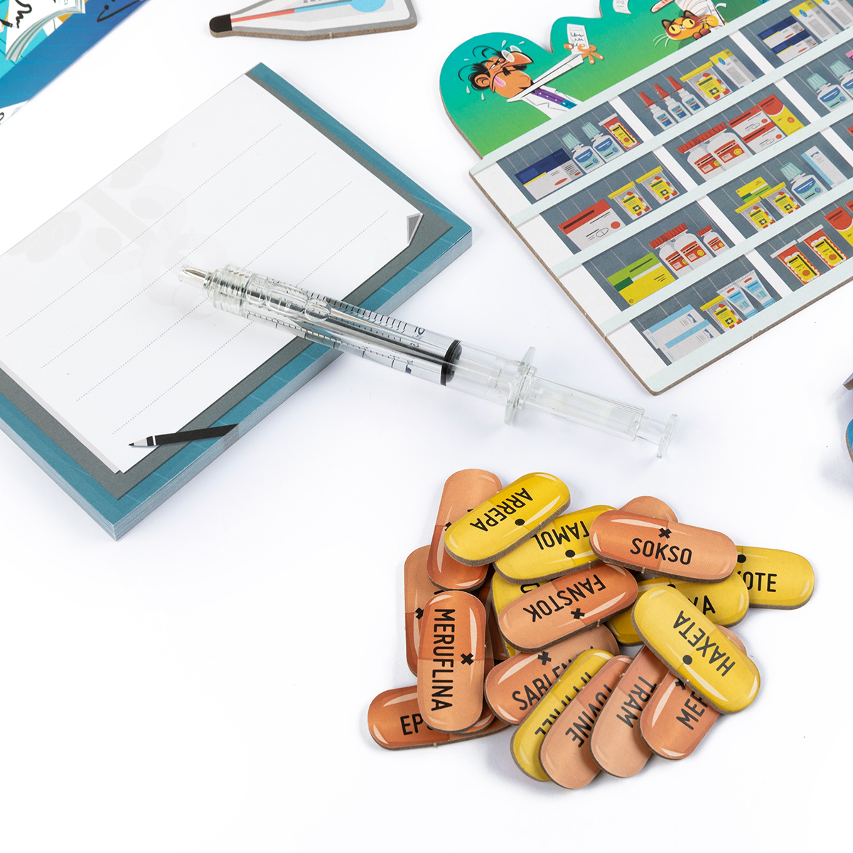 Затем за 2 минуты остальные игроки-аптекари должны расшифровать записи доктора и составить названия лекарств с помощью специальных жетонов пилюль, на которых написаны части слов или символов.
