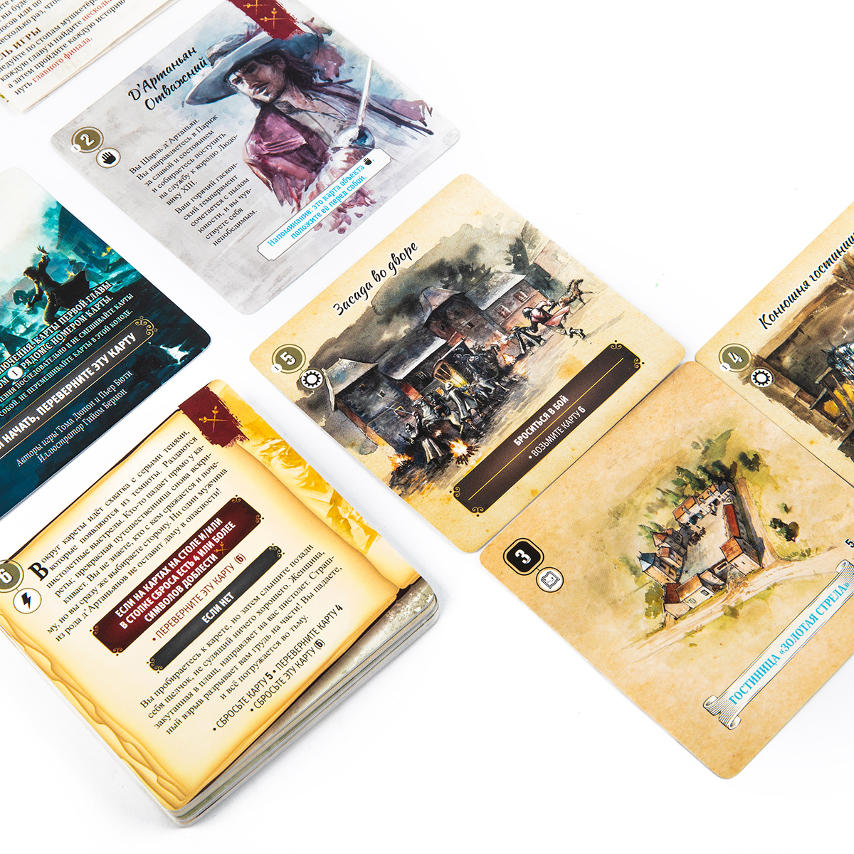 Чтобы начать, переверните первую карту и следуйте инструкциям. Постепенно сформируется карта местности, на которой вас будут ждать персонажи, предметы, опасности и большое количество сюжетных развилок.