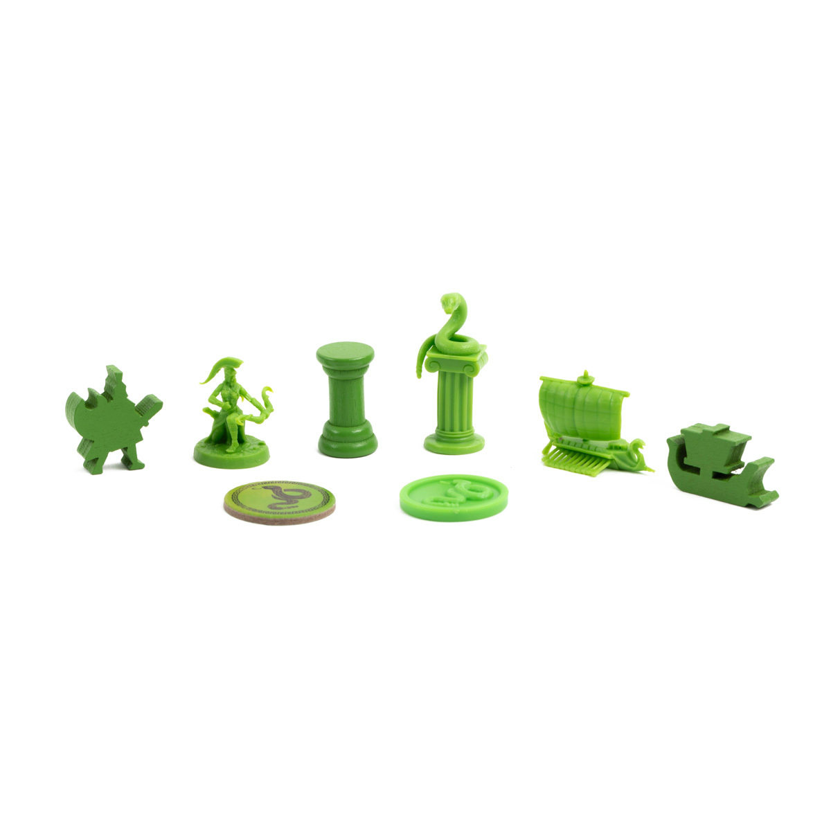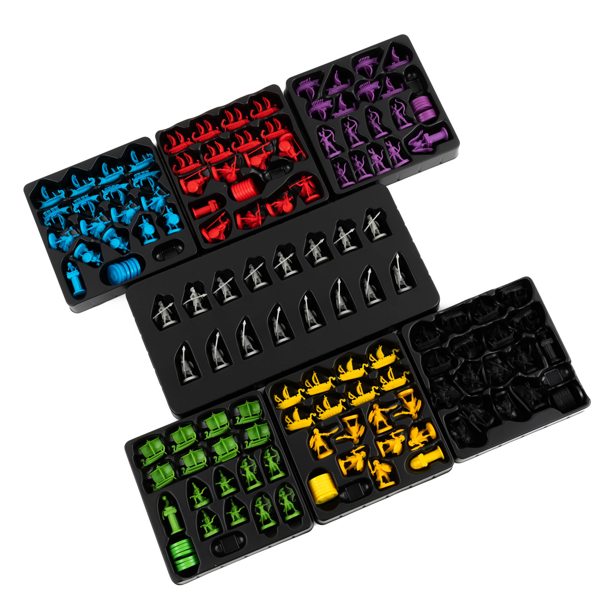 В этом дополнении вас жду 6 наборов игроков разных цветов. Каждый набор игрока содержит уникальный вид кораблей, 2 вида фигурок отрядов, фишку подношения и жетон контроля с символом фракции: рыбой, львом, змеёй, скорпионом, орлом или быком.