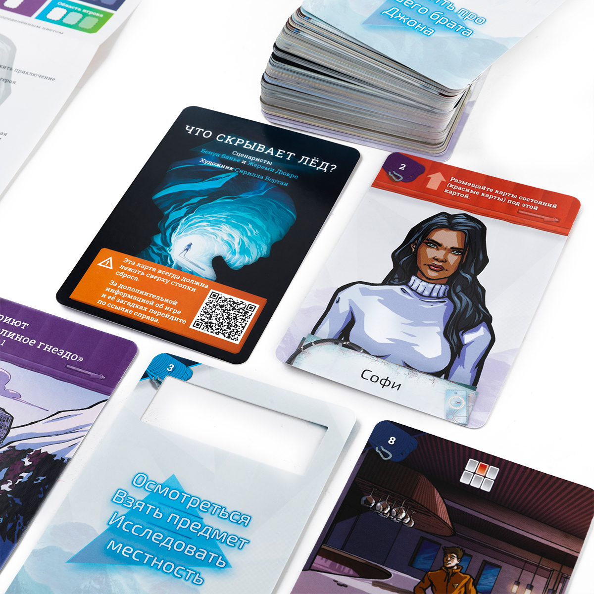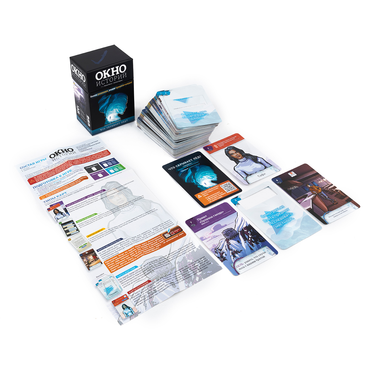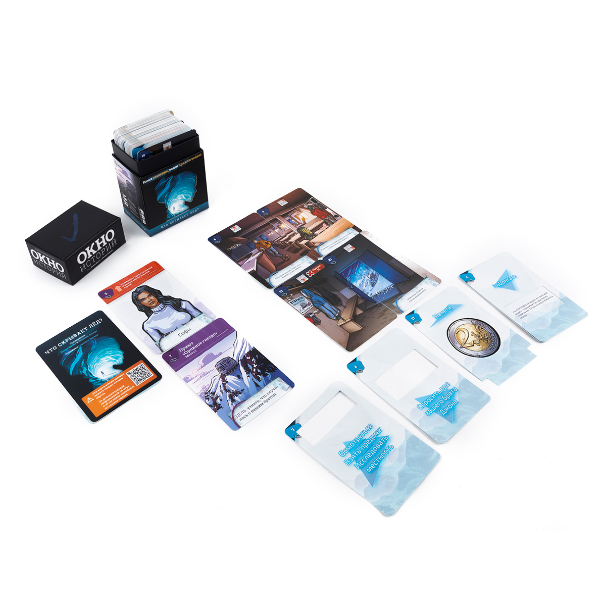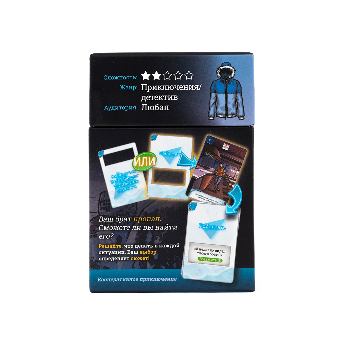 Серия «Окно историй» — это приключенческие повествовательные игры, в которых вы действуете в роли того или иного персонажа. В играх серии вы будете разгадывать головоломки и принимать влияющие на сюжет решения. В отличие от некоторых других игр жанра, в данной серии представлена интересная механика, которая отчасти может напомнить компьютерные игры, в которых вы взаимодействуете с пространством и предметами, окружающими героя. У вас будут карты обстоятельств, которые показывают всё, что окружает персонажа, а также карты действий с окошками или выемками, которые представляют собой варианты действий, предметы или другие объекты, которые можно использовать для взаимодействия с картами обстоятельств. А сама механика взаимодействия проста: вы выбираете карту действия и прикладываете её к оборотной стороне карты обстоятельств, а затем переворачиваете и смотрите видимую информацию.