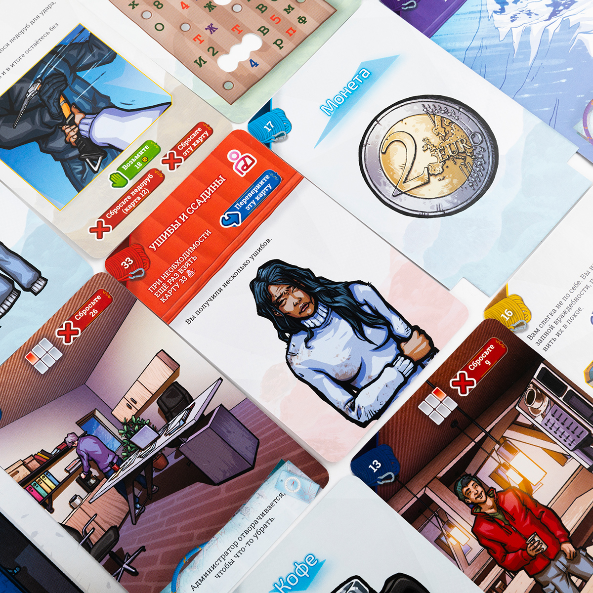 Иногда у вас будет возможность расшифровать секретный код. Вы можете взять карту с полученным номером из колоды, только если на ней рядом с номером нарисована лупа. Если на карте, которую, по вашему мнению, вам следует взять, нет изображения лупы, значит, это не та карта - вы неправильно отгадали номер.