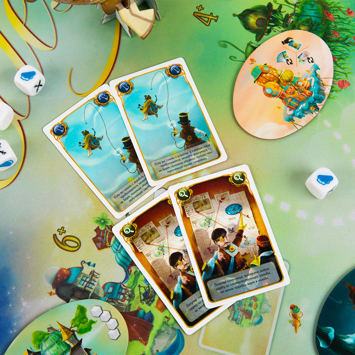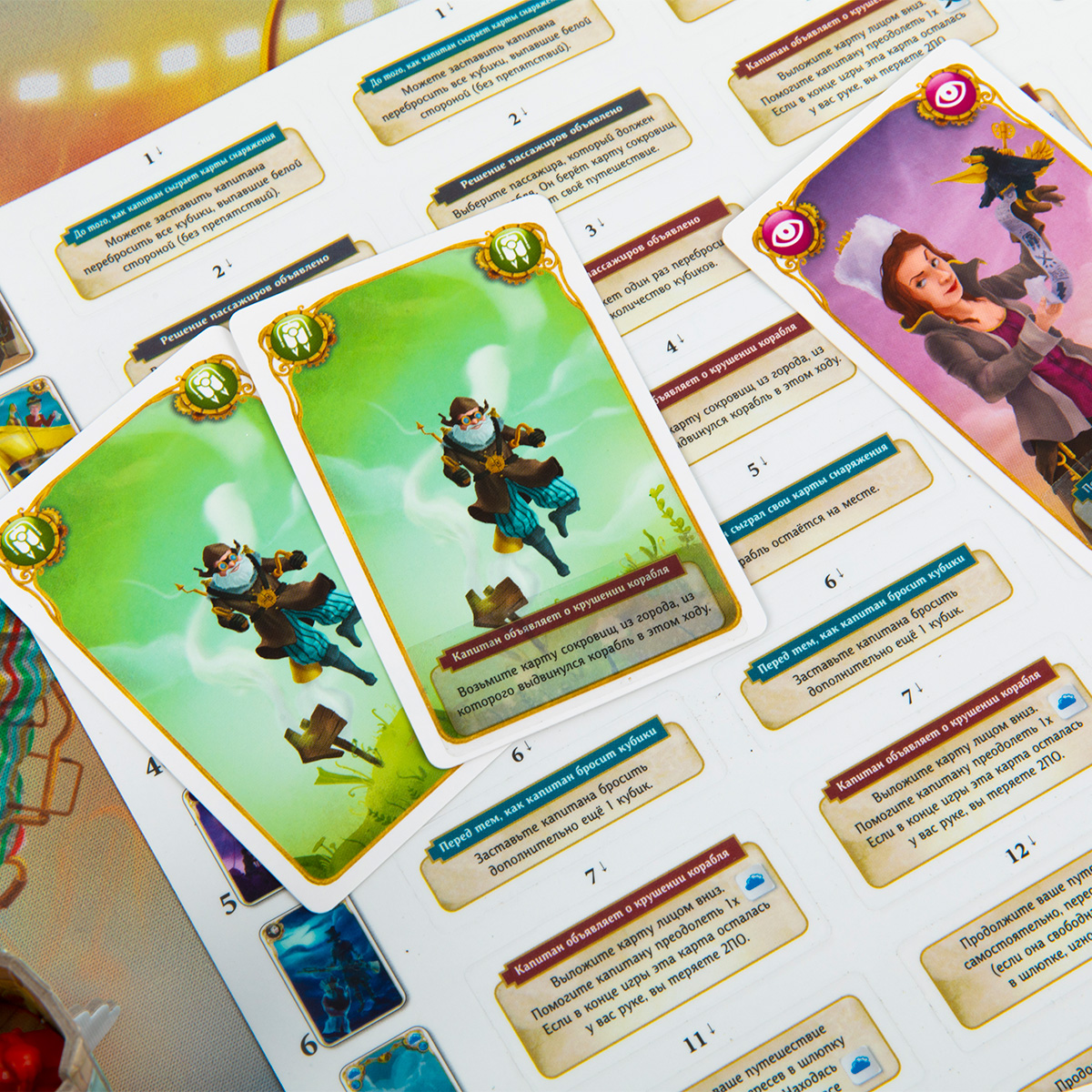 3. Если кто-то из пассажиров считает, что капитан не справится с задачей, он вынимает из корабля фигурку Искателя приключения своего цвета и переставляет ее на свой жетон. Оставшиеся в городе игроки берут верхние карты Сокровищ из соответствующей колоды.