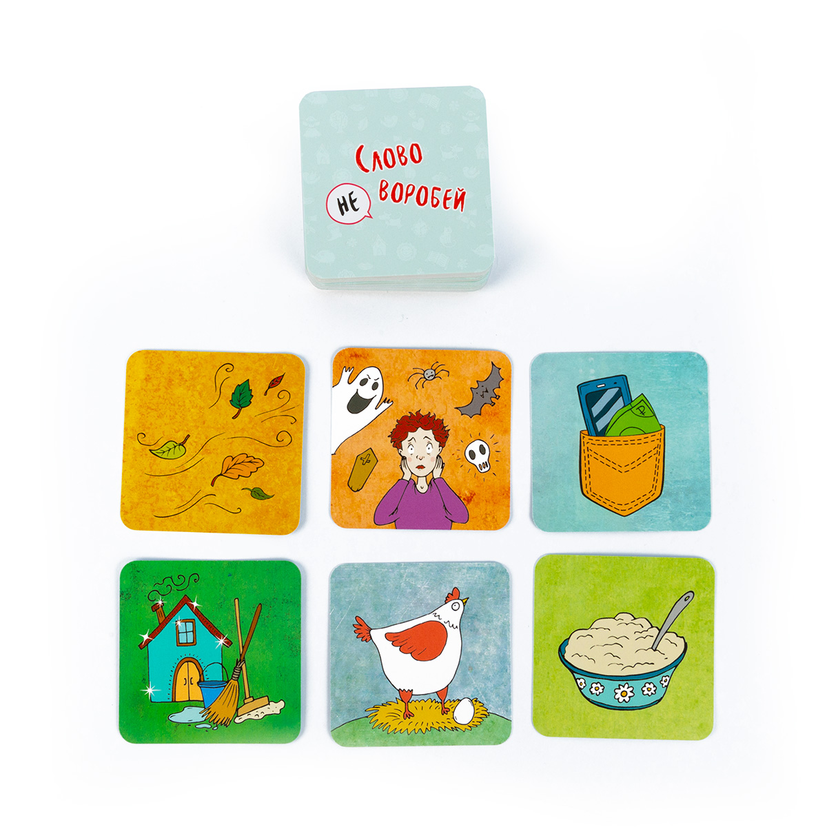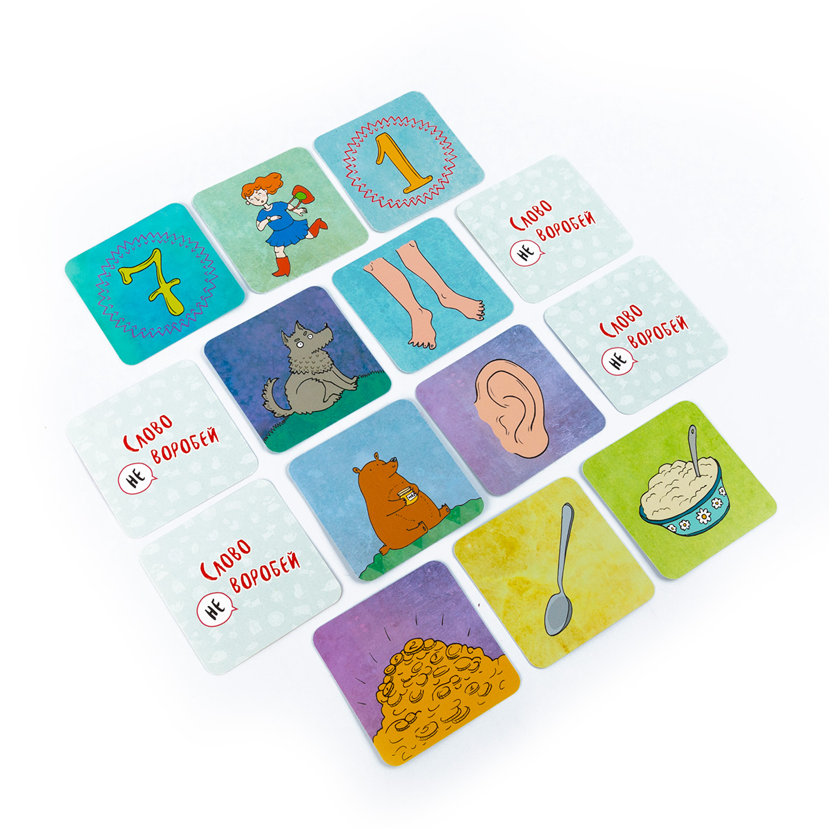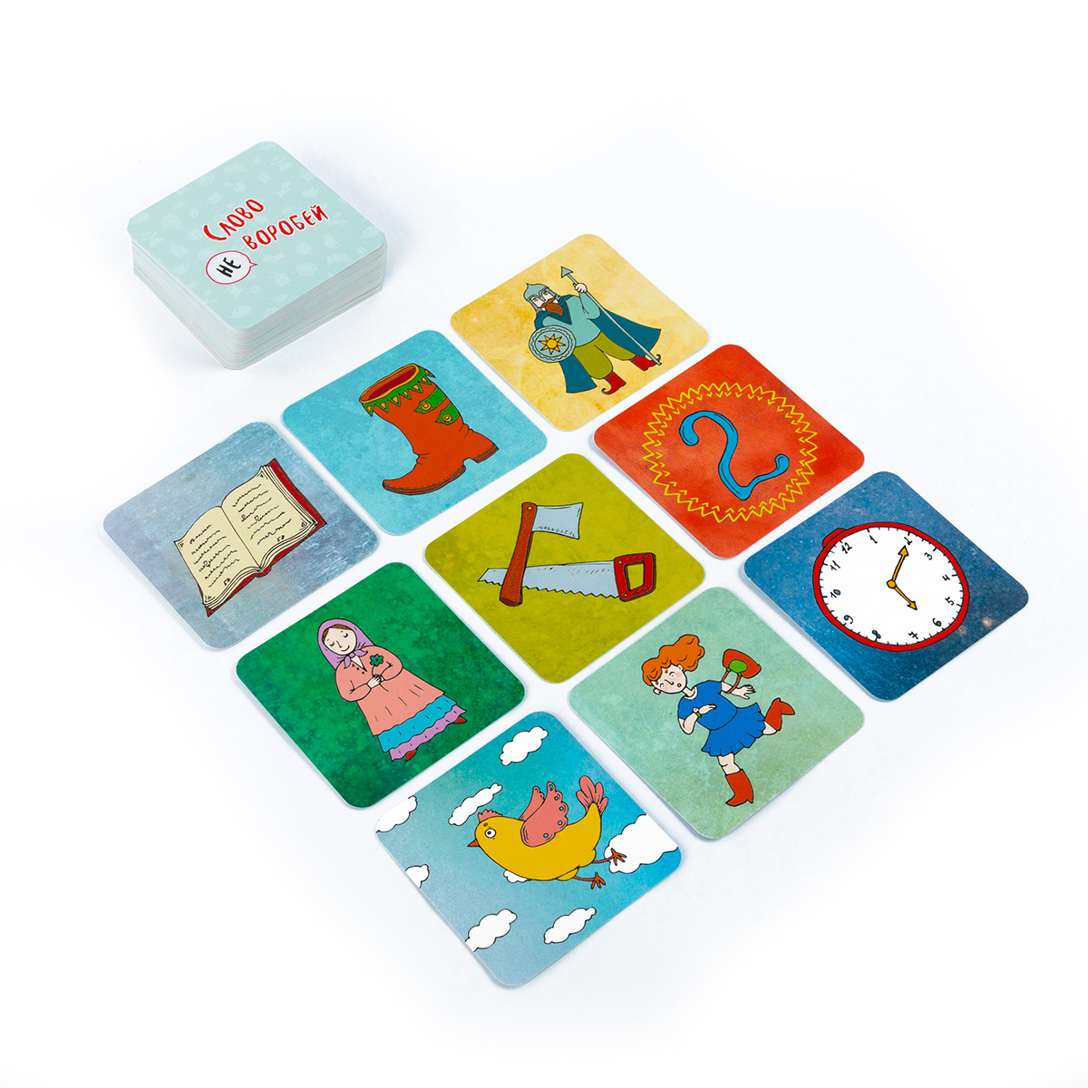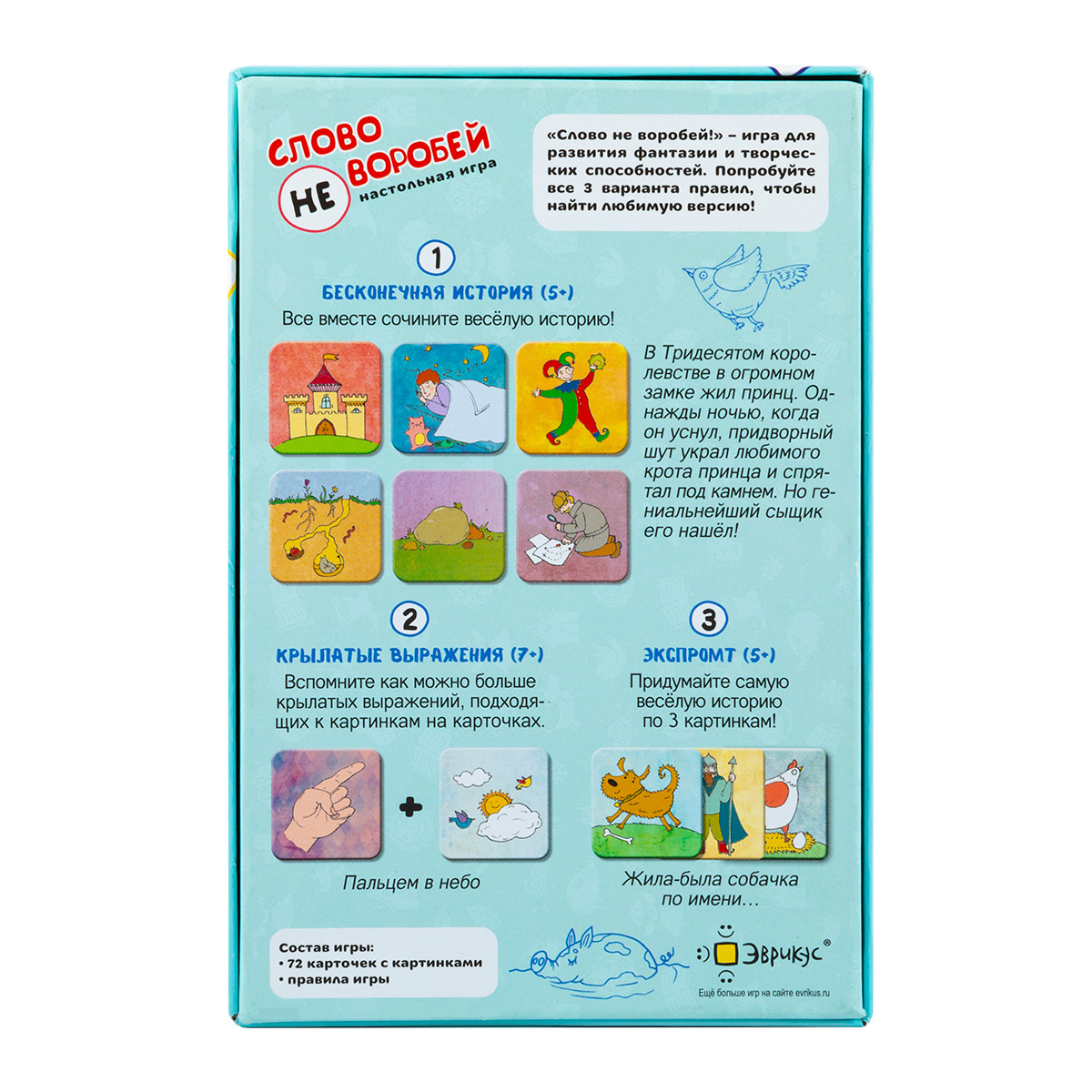 «Слово не воробей» — настольная игра, в которой сочиняются сказки, оживают персонажи и крылатые выражения. Несколько вариантов правил позволят найти интересный вариант и для детей, и для взрослых. Можно всем вместе сочинять бесконечную историю, тренируя память, можно рассказывать историю по случайным карточкам, проверяя свою находчивость, можно вспоминать крылатые выражения, оживляя картинки.