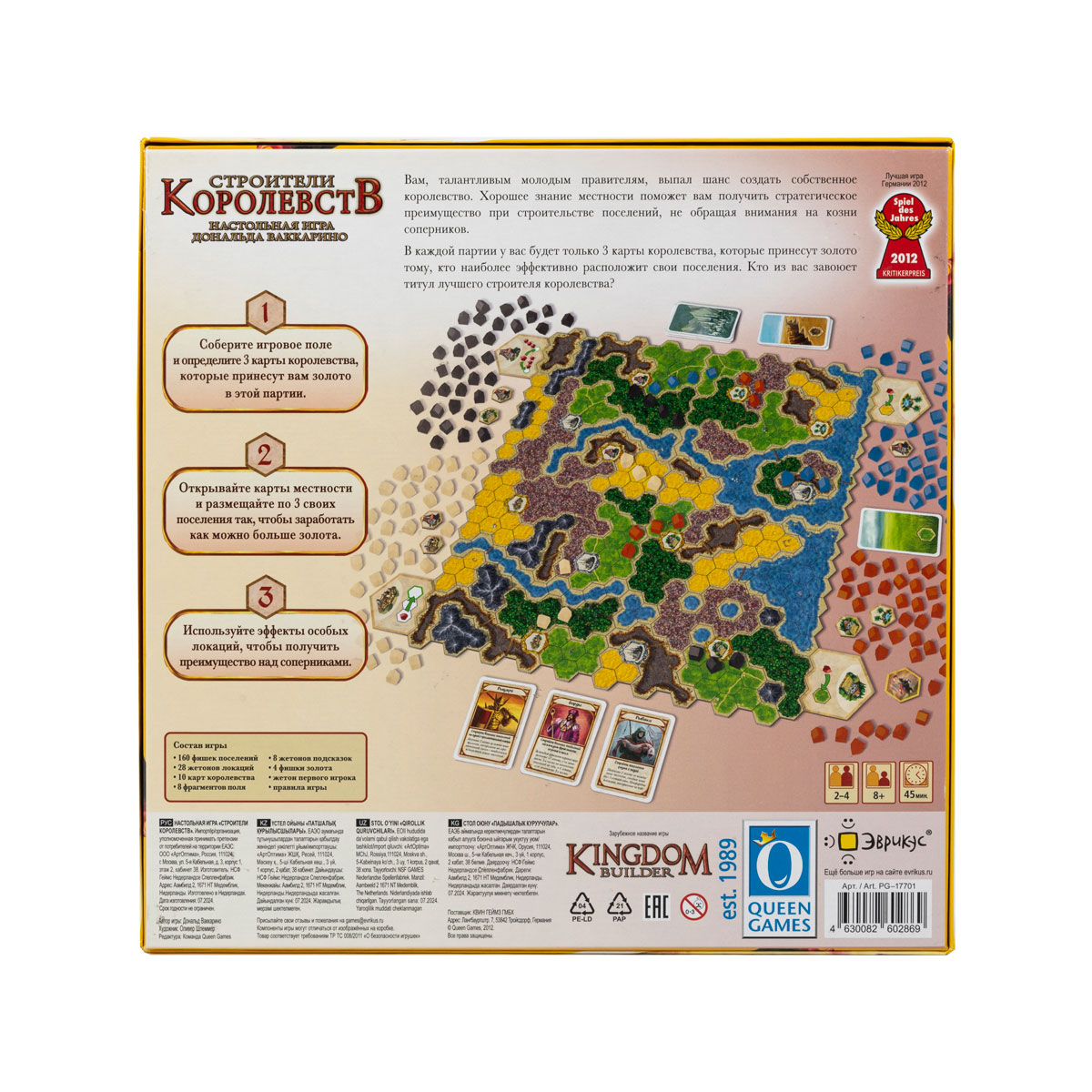 «Строители королевств» — это семейная игра, в которой игроки будут размещать свои поселения на игровом поле с помощью карт местности, чтобы как можно лучше выполнить 3 цели, случайным образом выбираемые для игры, и получить заветное золото за их выполнение в конце игры. Игрок, набравший больше всего золота, становится победителем игры!
