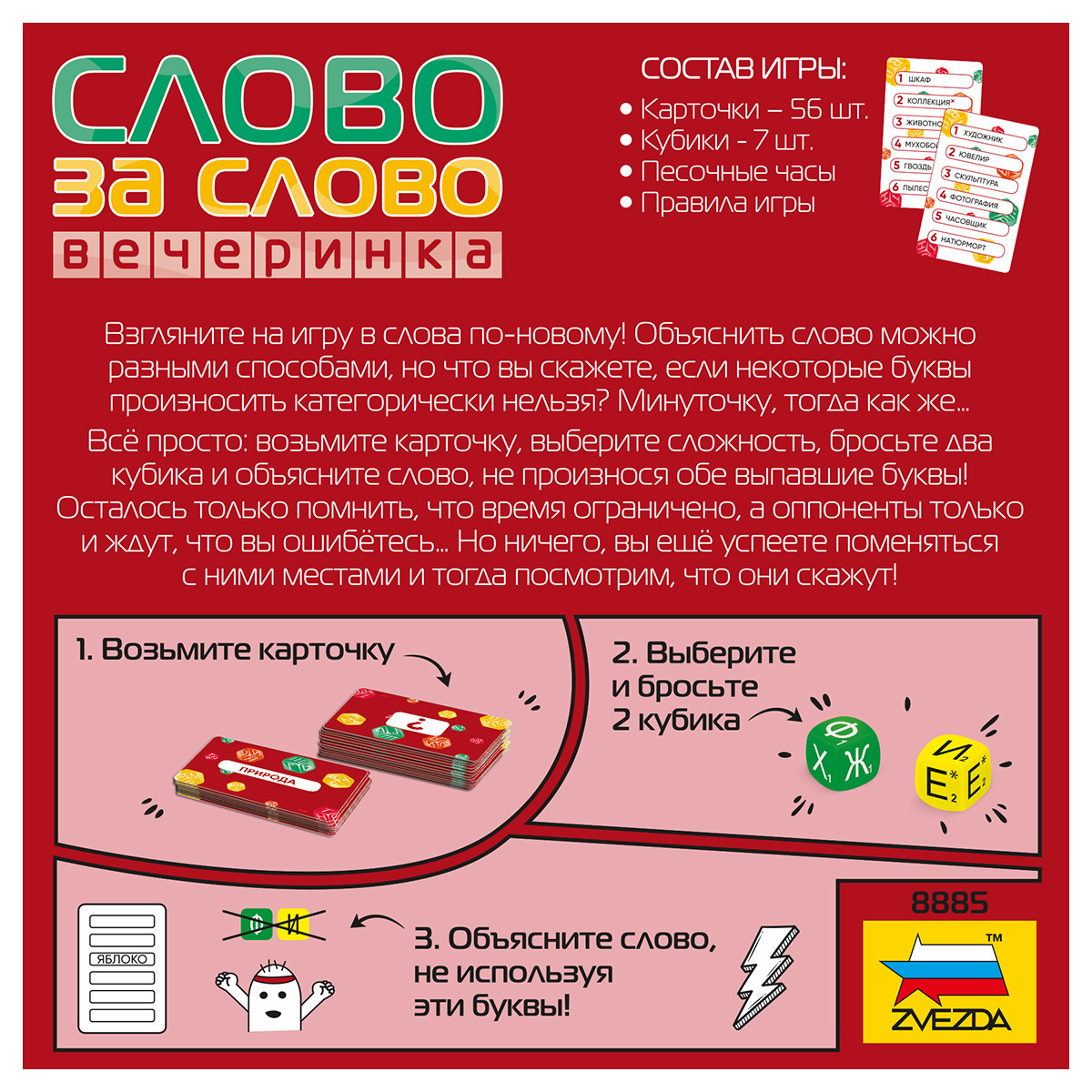 Берите карточку, выбирайте слово, бросайте два кубика и объясняйте слово, не произнося обе выпавшие буквы. Скучно точно никому не будет, ведь пока один пытается объясниться, остальным надо не только слово отгадать, но и следить, не допустил ли он ошибку. Получайте победные очки и веселитесь, отгадывая слова и ловя говорящего на промахах!