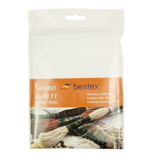 Канва Bestex 11 каунта предназначена для вышивания счетным крестом. Соответствует популярной канве Aida 11 плотностью 40 клеток на 10 сантиметров. Aida 11 – сетчатый материал, который позволяет выкладывать крупные стежки. Лучший выбор для начинающих, а также для мастериц с ослабленным зрением. Изготовлена из 100% хлопка. Рекомендации: чтобы защитить материал от осыпания, обработайте его края вручную или на швейной машине. Цвет: белый. Размер отреза: 50х50 сантиметров. Этого хватит на 1 картину.