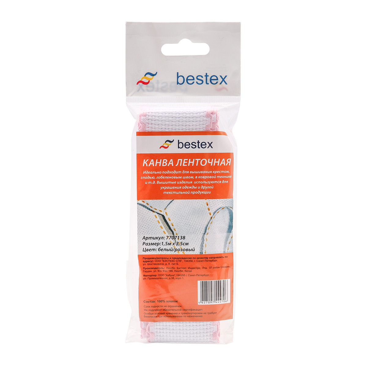 Канва для вышивания 'Bestex' в виде ленты изготовлена из 100% хлопка. Канва – ткань полотняного переплетения, удобная для выкладывания стежков. В материале переплетается основа с утком с частотой 6-12 нитей на 1 сантиметр. Идеально подходит для вышивания крестом, гладью, гобеленовым швом, в ковровой технике и других. Готовую вышивку можно использовать для украшения одежды, домашнего текстиля, закладок для книг и др. Работа, выполненная своими руками, станет отличным подарком для друзей и близких! Размер: ширина 3,5 см, продается отрезами по 1,5 м. Состав: 100% хлопок.