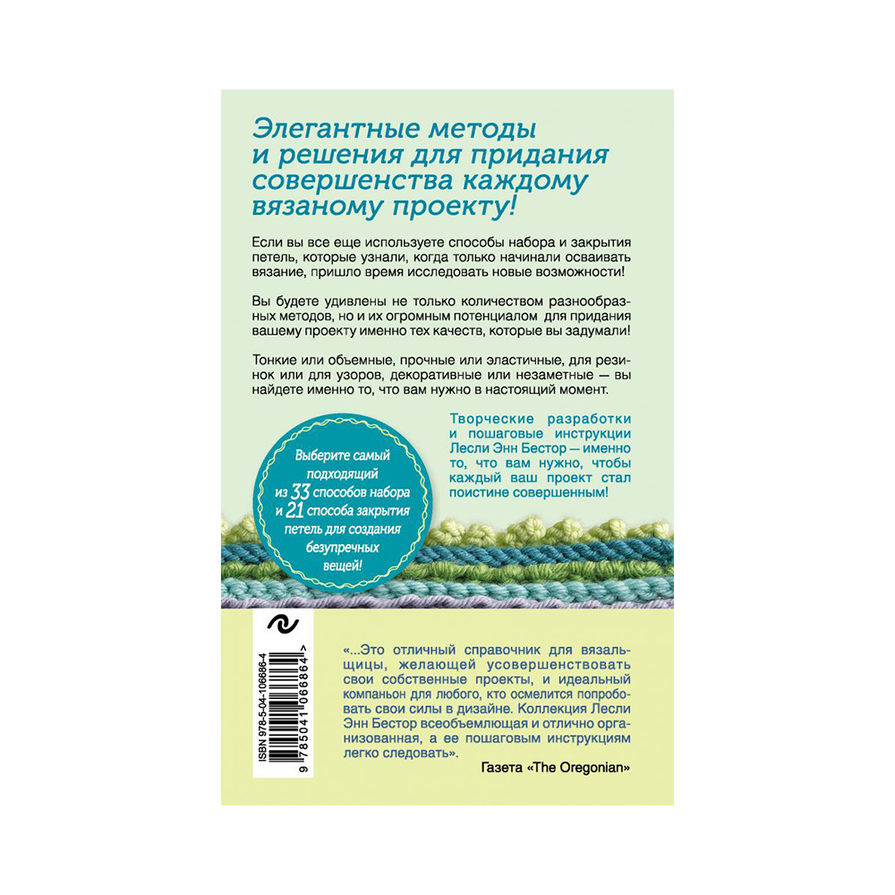 Откройте для себя идеальное начало и логичное завершение каждого вязаного проекта! Если вы все еще используете те же методы набора и закрытия петель, которые изучили, когда только начинали вязать, пришло время исследовать новые возможности! Выберите из 33 способов набора и 21 способа закрытия тот, который сделает края вашего проекта именно такими, какими вы их задумали. Плотные или рыхлые, эластичные или не очень, фактурные или незаметные. Подробные инструкции в сочетании с пошаговыми фотографиями помогут вам легко освоить каждую технику. Учитель вязания и дизайнер трикотажа Лесли Энн Бестор превращает эту простую, казалось бы, тему в увлекательное чтение. Это отличный справочник для вязальщицы, желающей довести свой проект до совершенства, и идеальный компаньон для всех, кто хочет попробовать свои силы в дизайне!