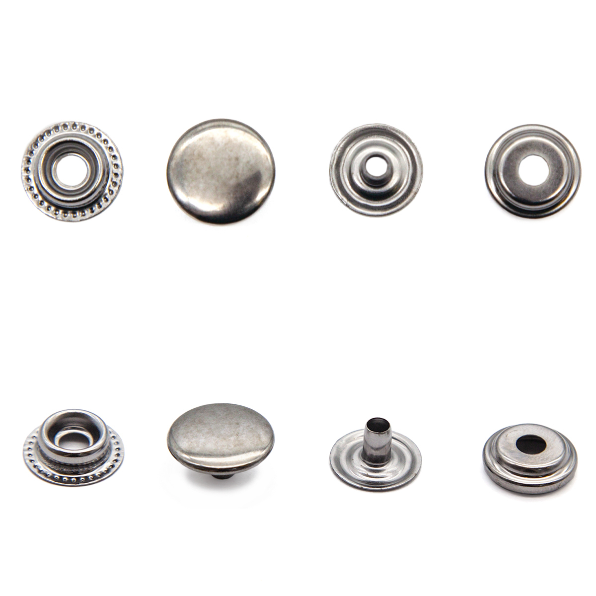 Минималистичные непришивные кнопки-застежки без украшений, гладкие, полусферической формы. Материал – сталь, тип контакта – "кольцо".