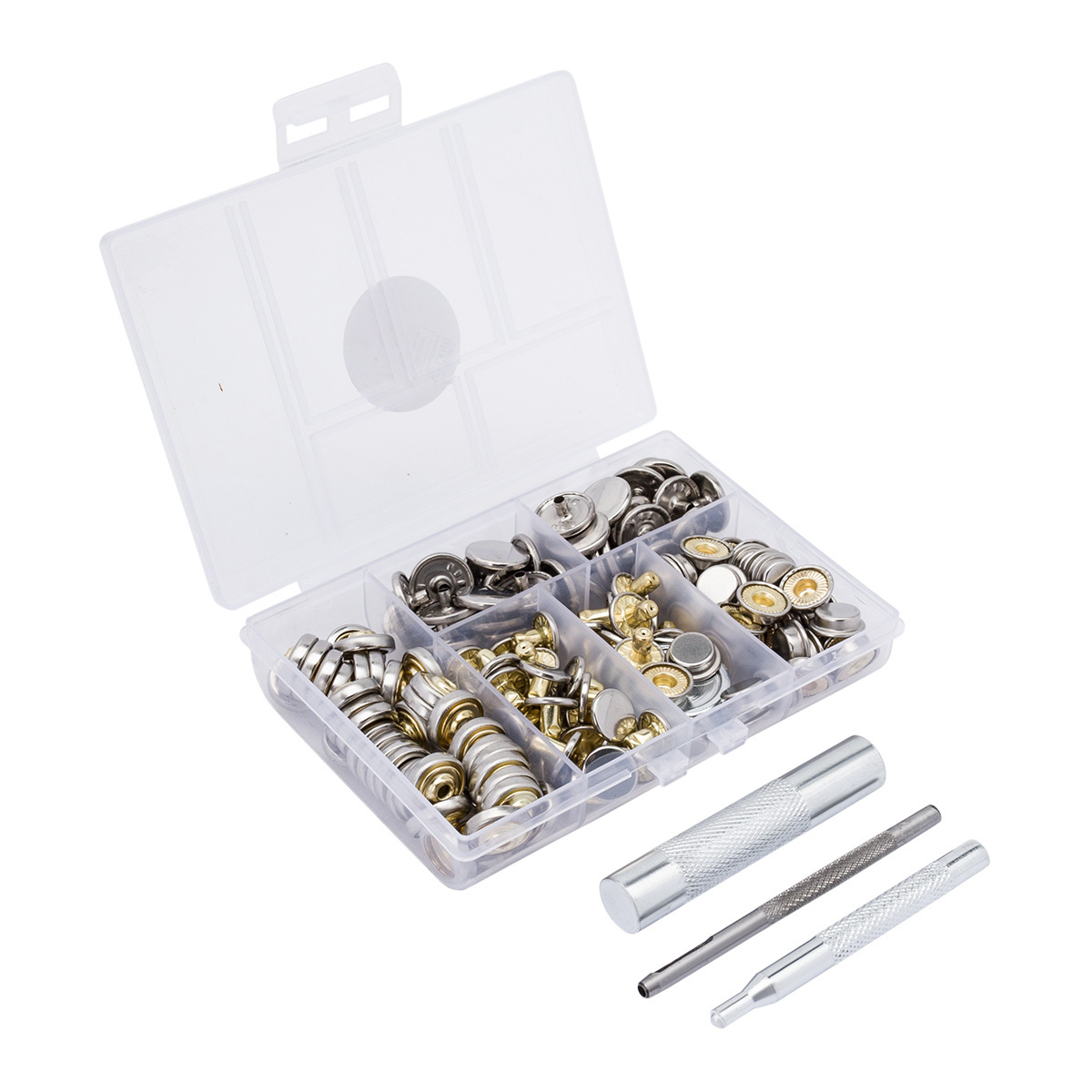 Кнопка Дельта (O-образная) ⌀15 мм, 40 шт, с установщ., в органайзере, 11,8х8,1х2,3см, серебряный