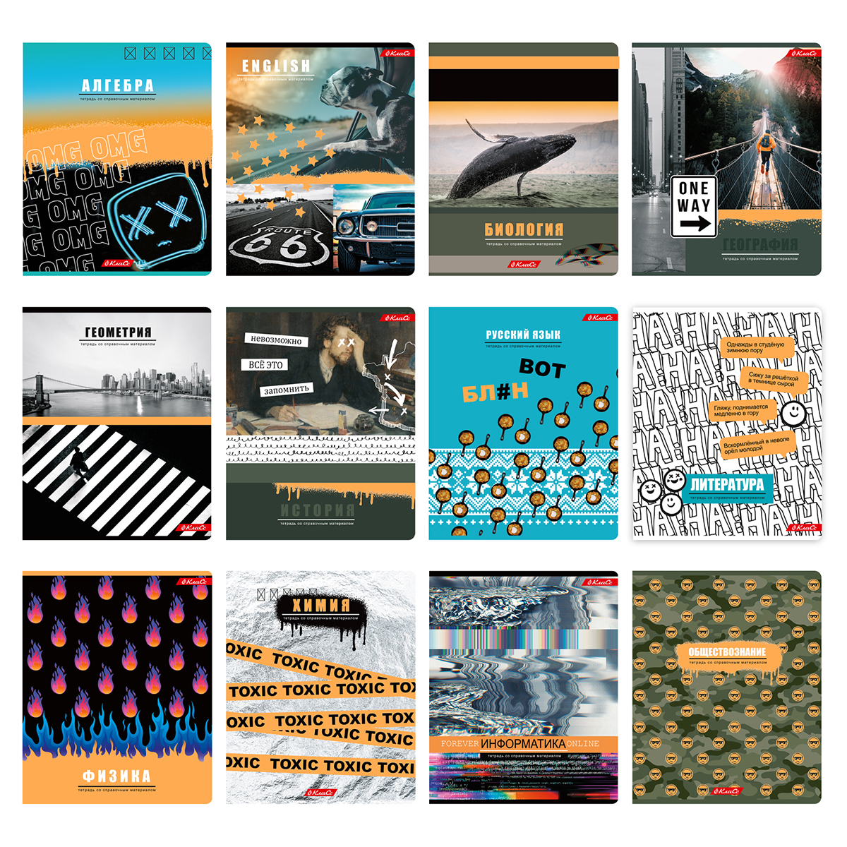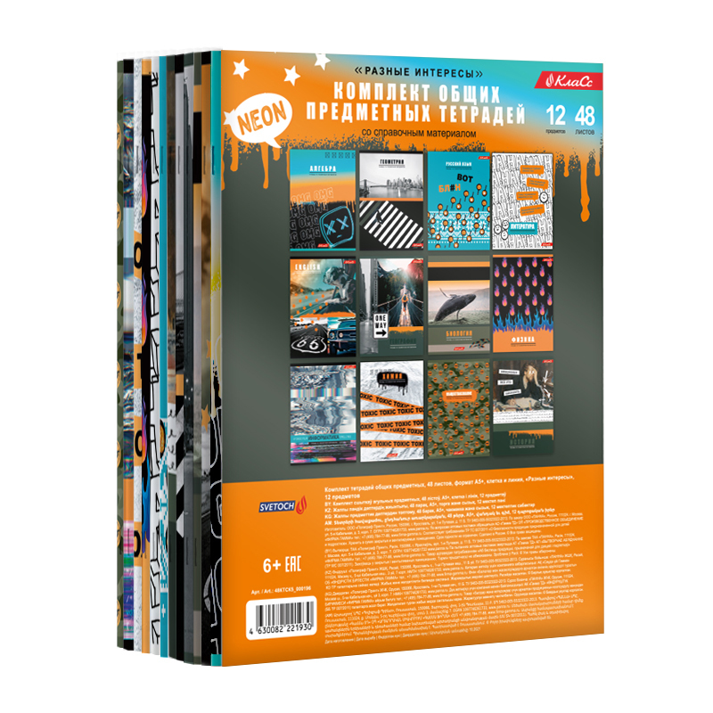 Комплект из 12 предметных тетрадей А5+ формата, 48 листов - предназначен для учащихся средних и старших классов. Предметы: алгебра, английский язык, биология, геометрия, география, история, литература, русский язык, физика, химия, информатика и обществознание. Внутренний блок: изготовлен из качественной писчей бумаги плотностью 65 г/кв. м, 100% белизны. Обложка из мелованного картона плотностью 190 г/кв. м. Линовка внутреннего блока тетрадей по русскому языку и литературе выполнена в линию, по остальным предметам в клетку. Вид скрепления - скоба. Дизайн изделия дополнен спецэффектом в виде неоновой краски. Тетради имеют закругленные уголки, красные поля, титульный лист, справочную информацию по предмету на форзацах и дополнительном листе.