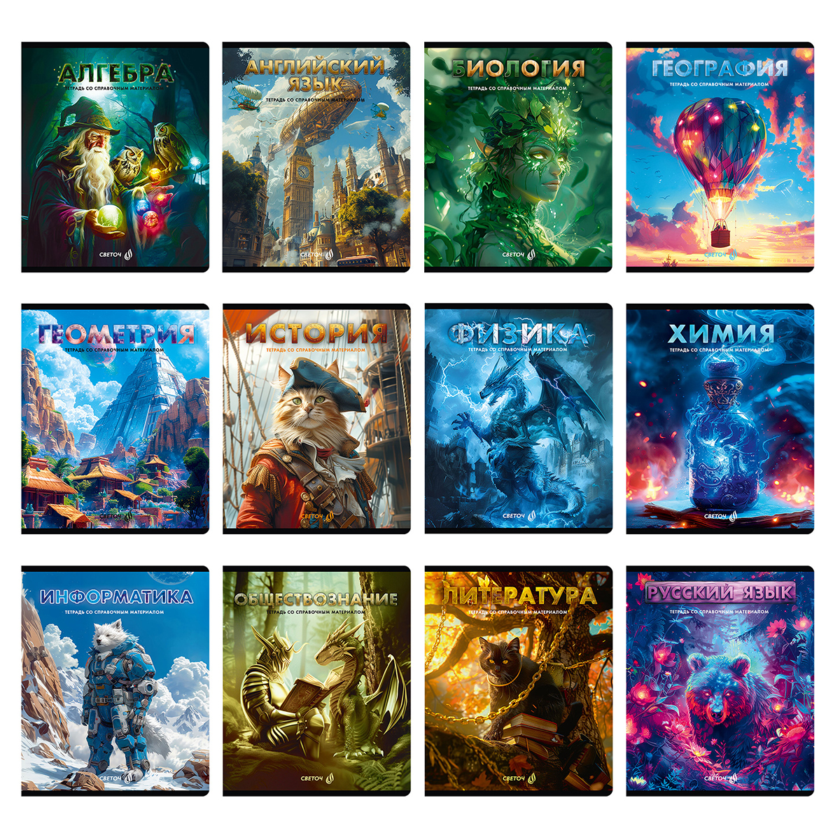 Комплект тетрадей со справочными материалами Остров легенд, сплошной лак, A5 48 л. 12 шт на скобе 65 г/м², белизна 100%, клетка/линия, 01337 12 предметов, Светоч Т150