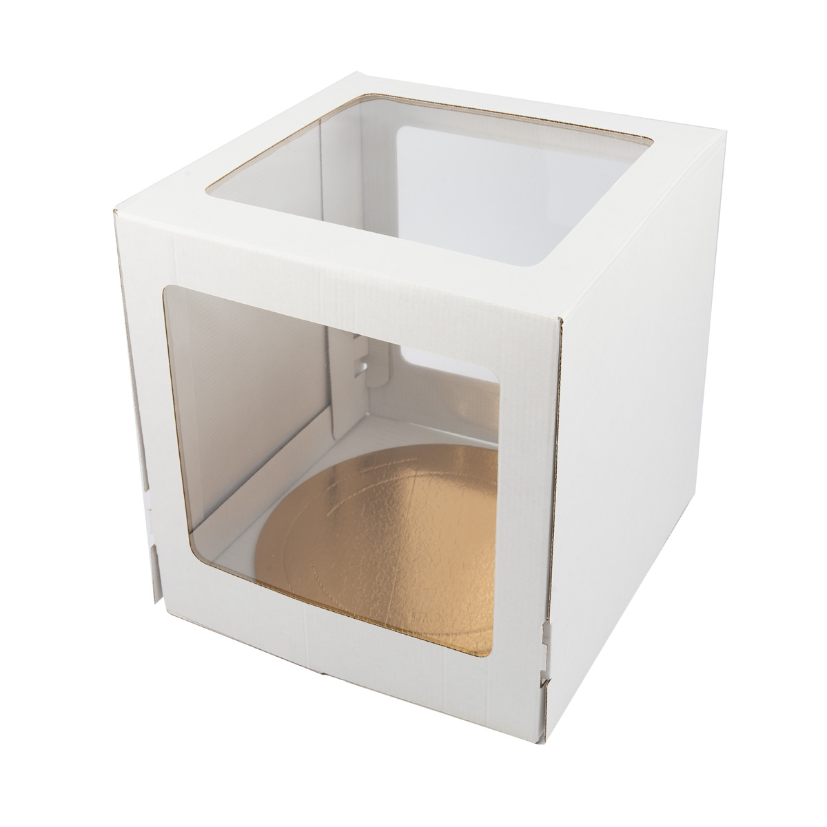 Короб для торта с размерами 26.5 * 26.5 * 29 см с тремя окнами предназначен для транспортировки и презентации кондитерского изделия. Размер окна 21 х 21 см. Большое окно позволяет видеть изделие и лучше презентовать его. Представляет собой универсальный вариант для упаковки большого торта. Изготовлен из высококачественного гофрированного картона. Короб белый снаружи и белый внутри. Короб защищает изделие от деформации. Коробка проста и удобна в сборке.