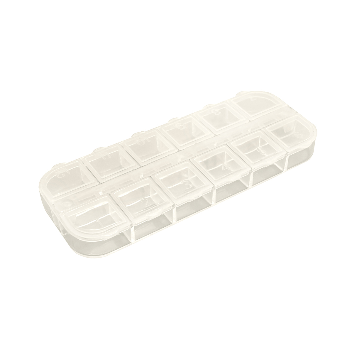 Контейнер из прозрачного пластика с 12 отделениями, каждое отделение с индивидуальной крышечкой на защелке. Предназначен для аккуратного хранения мелких деталей, так необходимых для каждой рукодельницы. Это могут быть пуговицы, бисер, бусины, фурнитура, а также небольшие остатки тесьмы, кружева, которым опытная рукодельница всегда найдет применение в создании оригинальных элементов декора. Контейнер небольшого размера с надежно закрывающейся крышкой - это позволяет взять его в дорогу, чтобы иметь под рукой необходимые мелочи. Кроме того, в контейнере можно хранить лекарства и различные дорожные мелочи, например, швейные или маникюрные принадлежности. Можно использовать для рыболовных принадлежностей.