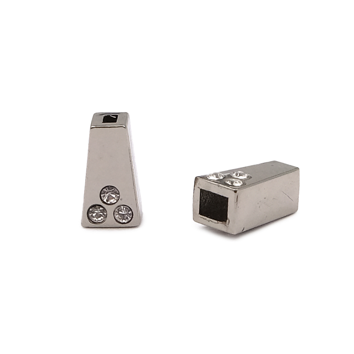 Концевик с четырехгранный со стразами защищает шнур от преждевременного износа и помогает аккуратно присоединить застежку к вашему украшению. Надевается на вощеный или кожаный шнур. Используется при изготовлении бус, колье или браслетов и другой бижутерии. Изготовлен из прочного металлического сплава. При использовании по назначению не темнеет от длительного контакта с кожей, защищен от ржавчины. Вставные стразы изготовлены из практичного акрила. Цвет: никель. Размер: 11х6,5 мм, внешний диаметр 2,5 мм и 4 мм. Количество в упаковке: 4 штуки.