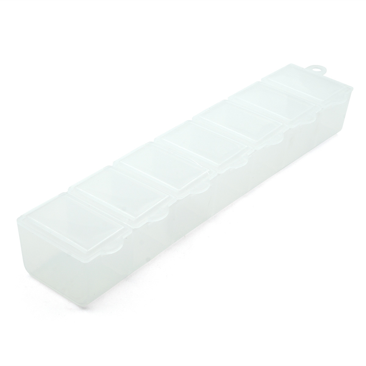Контейнер из прозрачного пластика с 7 отделениями, каждое отделение с индивидуальной крышечкой на защелке. Предназначен для аккуратного хранения мелких деталей, так необходимых для каждой рукодельницы. Это могут быть пуговицы, бисер, бусины, фурнитура, а также небольшие остатки тесьмы, кружева, которым опытная рукодельница всегда найдет применение в создании оригинальных элементов декора. Контейнер небольшого размера с надежно закрывающейся крышкой – это позволяет взять его в дорогу, чтобы иметь под рукой необходимые мелочи. Кроме того, в контейнере можно хранить лекарства и различные дорожные мелочи, например, швейные или маникюрные принадлежности. Можно использовать для рыболовных принадлежностей.