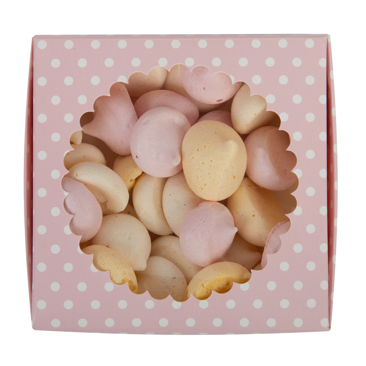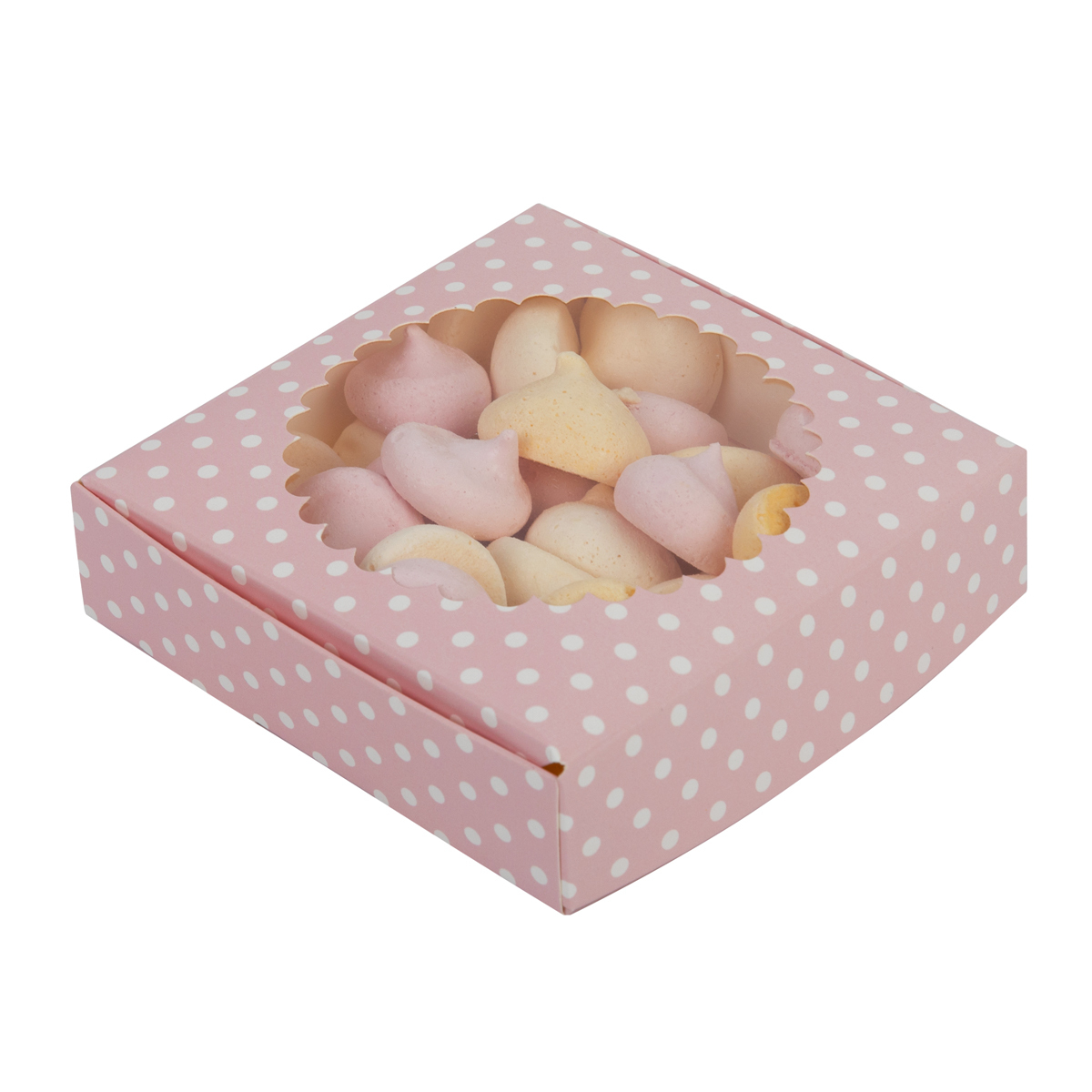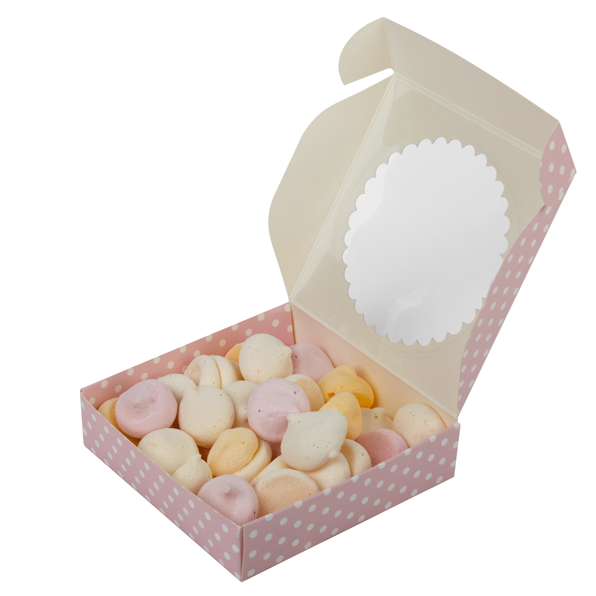 Коробка отличается небольшим размером, аккуратная, изящная, она подчеркнет любой вложенный в нее подарок, будь то разноцветные пирожные макарон, собственноручно изготовленное печенье, мини-безе к чаю, зефир.