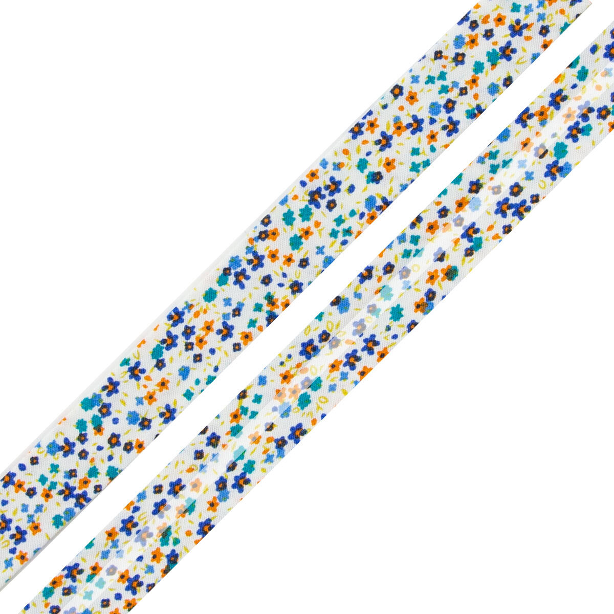 Готовая косая бейка с принтом 'Цветочки новые', ширина 15мм. Косая бейка – выкроенная по косой полоска ткани, которая используется для окантовки разнообразных деталей одежды. Бейка является незаменимым элементом любого качественного изделия. С помощью косой бейки можно быстро и надежно обработать края ткани, создав эстетичную и привлекательную вещь. Косая бейка используется в качестве отделки, для обработки бортовых срезов на ткани, горловины, пройм, низа рукавов одежды, а также для декорирования текстильных изделий. Качественный материал, для изделий из натуральных тканей, таких как хлопок, лен. Состав: 60% хлопок, 40% полиэстер.