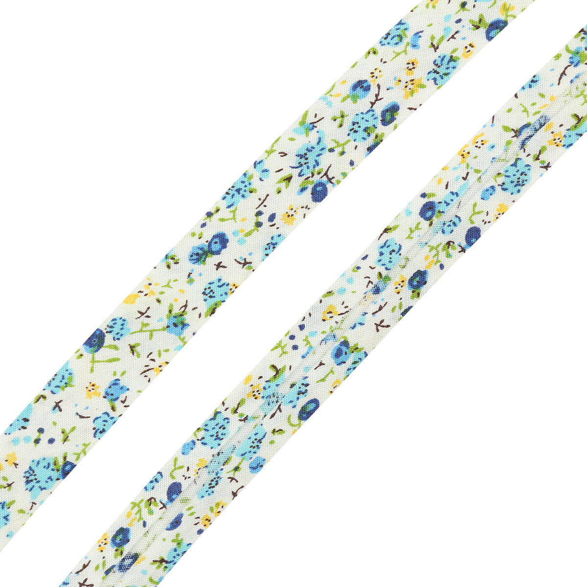 Косая бейка хлопковая с рисунком Цветы 15 мм / 5 метров, FBF37 голубой