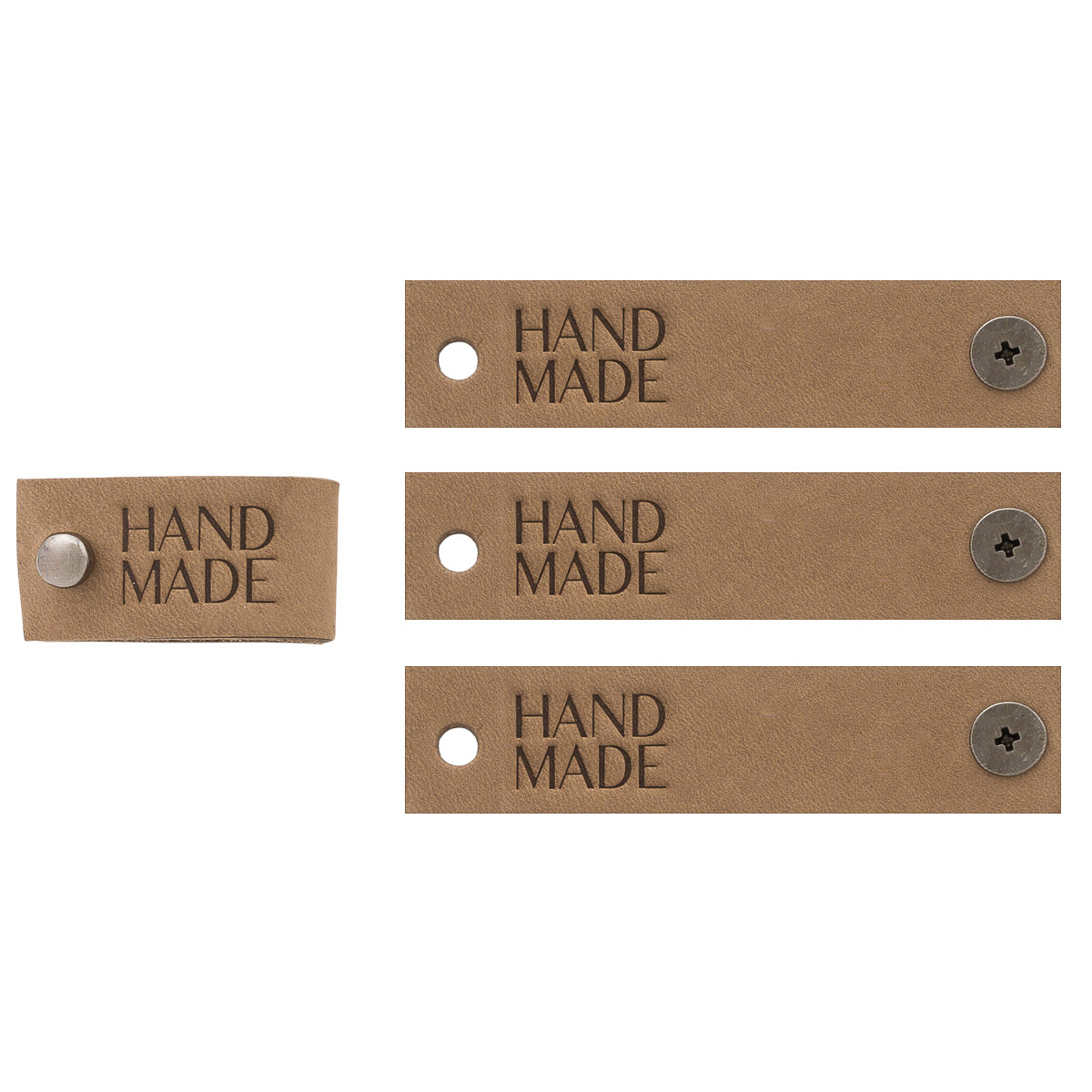 Кожаные бирки с тиснением на кнопке Hand Made 17х70 мм, 4 шт, капучино