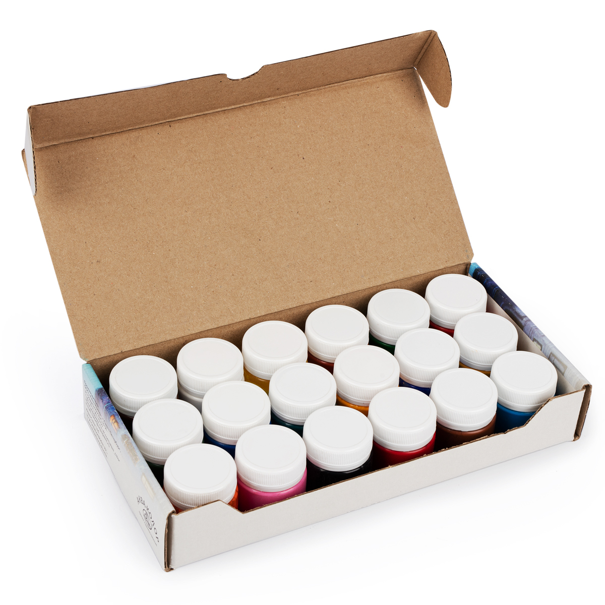 Краски образуют водостойкое, долговечное покрытие, не желтеющее со временем, обладающее отличным сцеплением со всеми подложками. Акриловые краски изготавливаются из акриловой дисперсии в качестве связующего и пигментов, используемых в традиционных и художественных красках. Набор акриловых красок из 18 цветов по 20 мл.