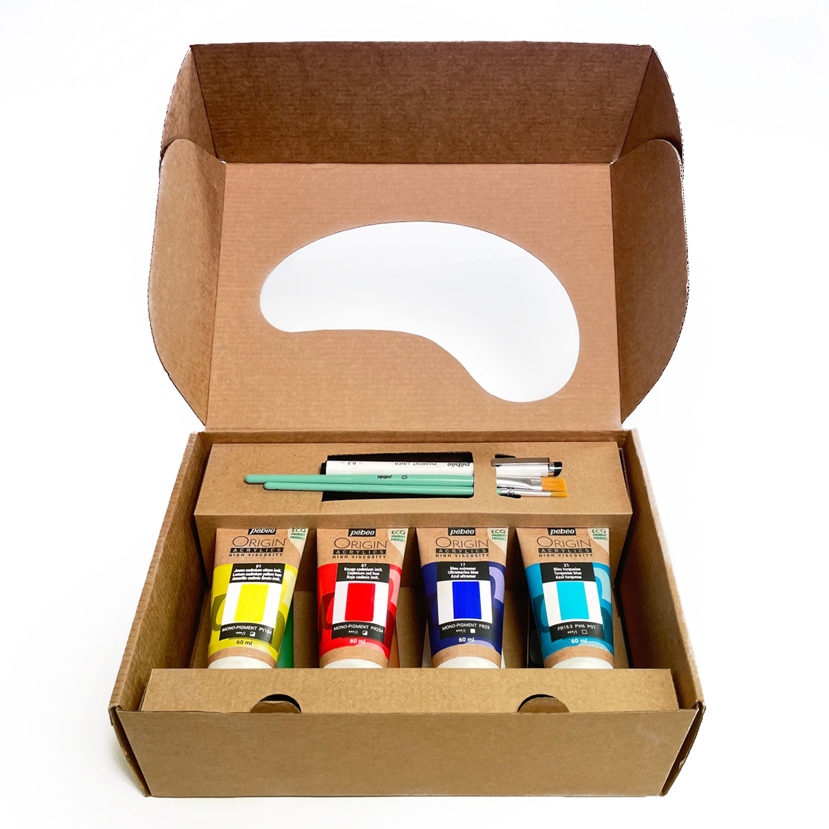• 8 цветов Origin Acrylics по 60 мл: кадмий жёлтый лимонный имитация, кадмий красный имитация, ультрамарин синий, бирюзовый, зелёный светло-перманентный, сиена натуральная, титановые белила и Марс чёрный.