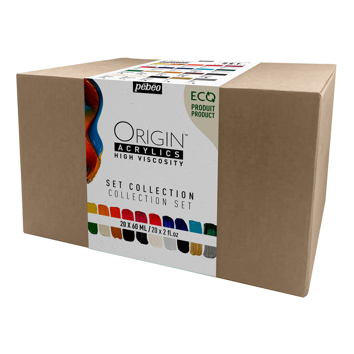 Набор из 20 цветов Origin Acrylics по 60 мл. включает 10 основных цветов для каждого художника: имитация кадмия среднего желтого, имитация кадмия оранжевого, хинакридоновая пурпурная, ультрамариновая синяя, бирюзовая синяя, зеленая Хукера, желтая охра, серая Пэйна, титановые белила и марс черный.