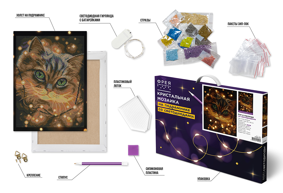 В данном наборе холст уже натянут на деревянный подрамник, поэтому вам не придется оформлять его в багет. Готовую работу сразу можно поставить на полку или повесить на стену при помощи специального крепления. А благодаря тому, что под холстом находится подложка, провисание основы при выкладывании картины исключается. Увлекательный процесс создания картины поможет развить мелкую моторику рук и интересно провести время за творческим занятием.