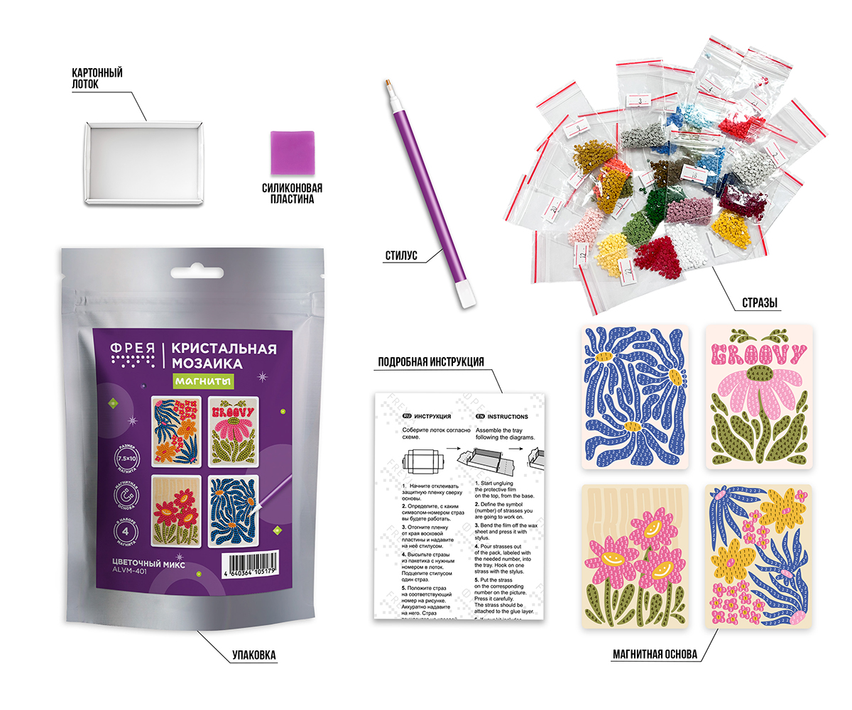 Кристальная (алмазная) мозаика Фрея ALVM-401, набор магнитов, Цветочный микс, 7.5х10 см