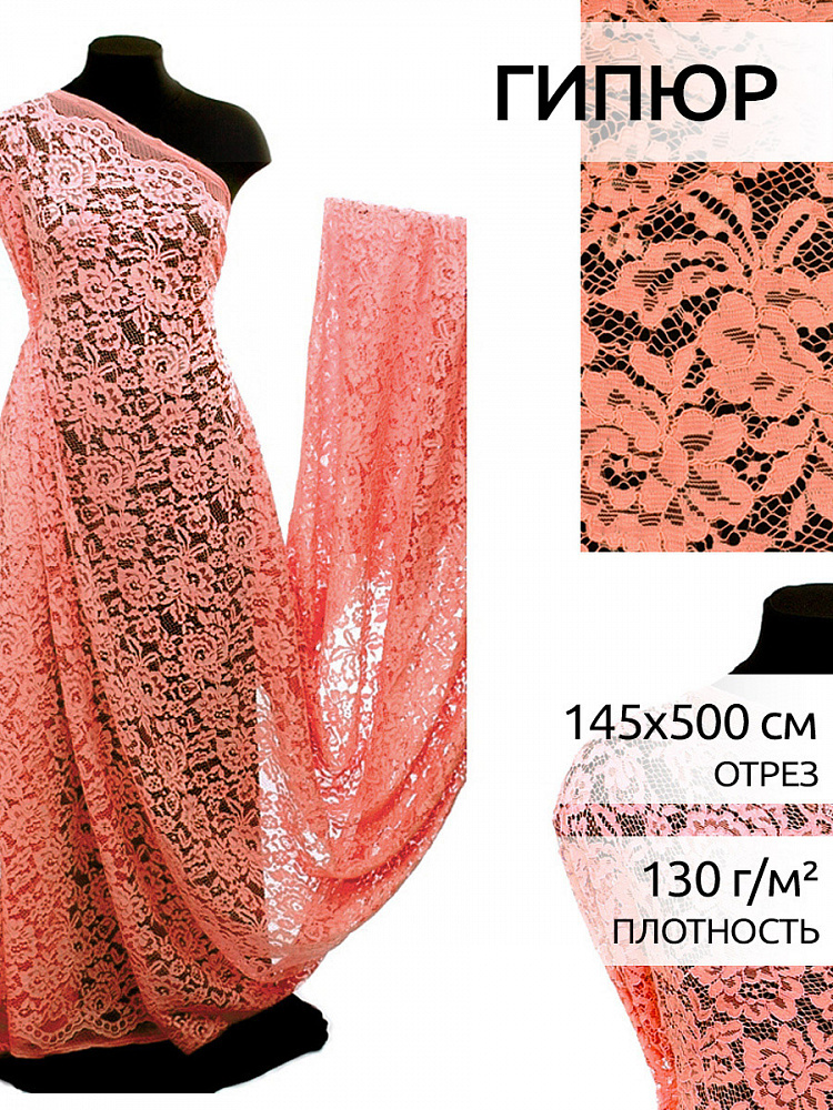 Ткань кружевная (гипюр) в нарезке с кордом диз.LN-3002 шир.145 см, 130 г/м², цв.816 персик, 5 метров