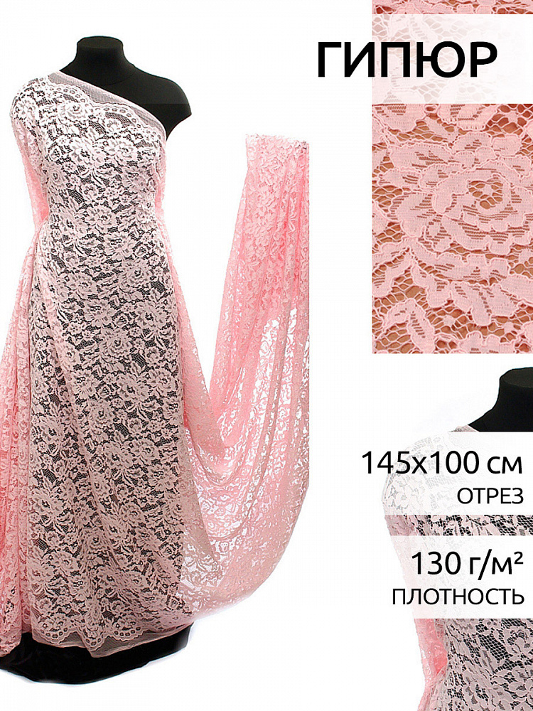 Ткань кружевная (гипюр) в нарезке с кордом 130 г/м², 145 см / 1 метр, TBY.LN-3002, цв.132 св.розовый