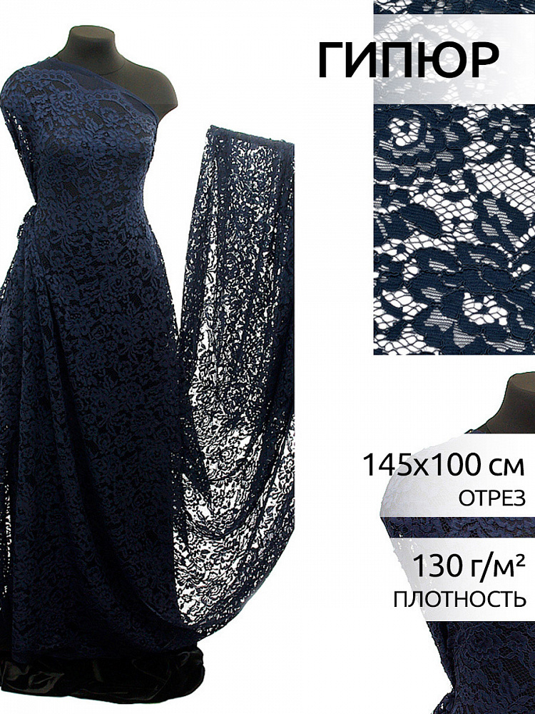 Ткань кружевная (гипюр) в нарезке с кордом 130 г/м², 145 см / 1 метр, TBY.LN-3002, цв.т.синий