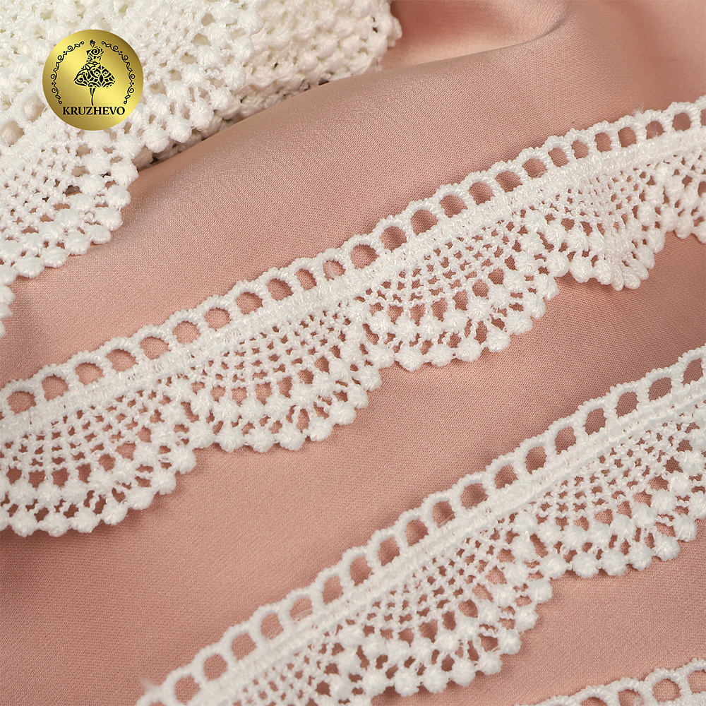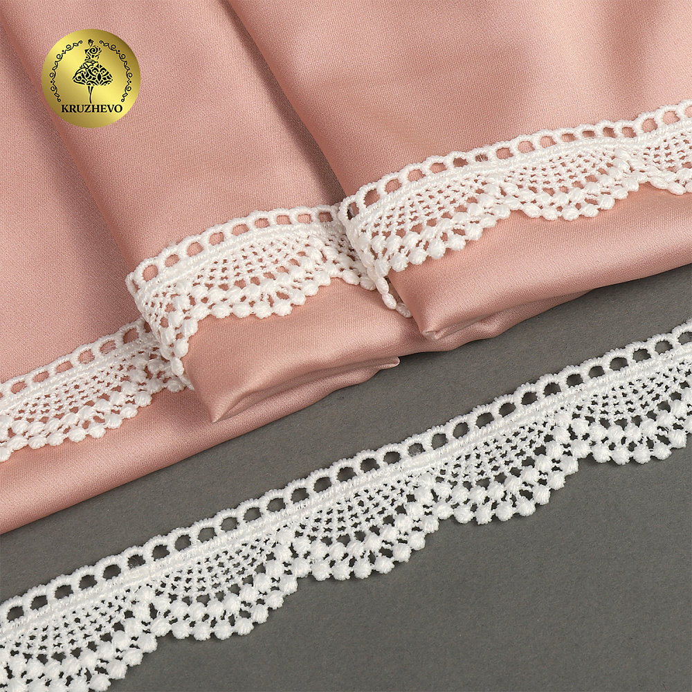 Легкое, ажурное кружево гипюр. Мягкое, но при этом очень прочное за счет полиэстеровых нитей. Имеет благородный блеск. Хорошо держит форму. Широкая область применения: начиная от одежды и свадебных нарядов, заканчивая декором интерьера.