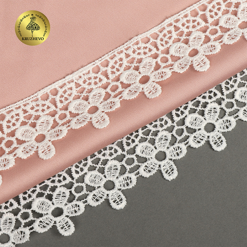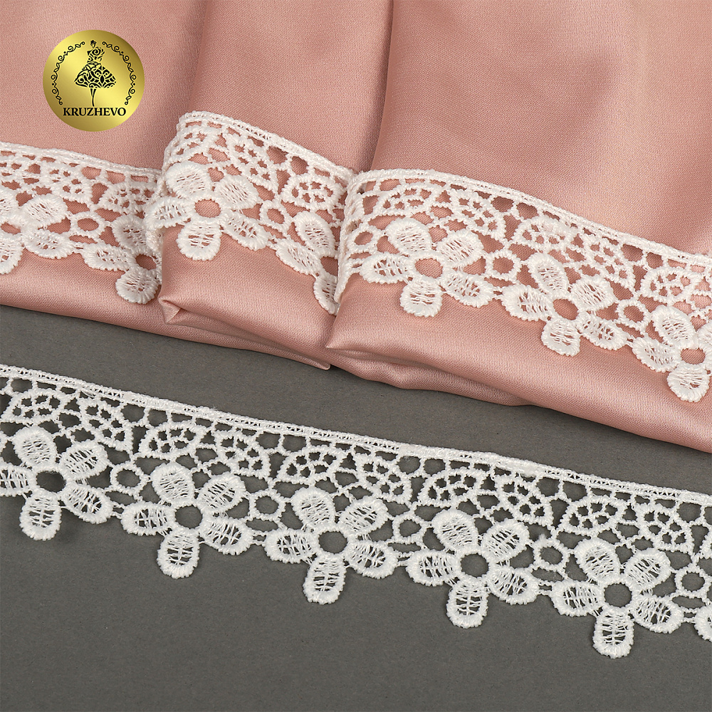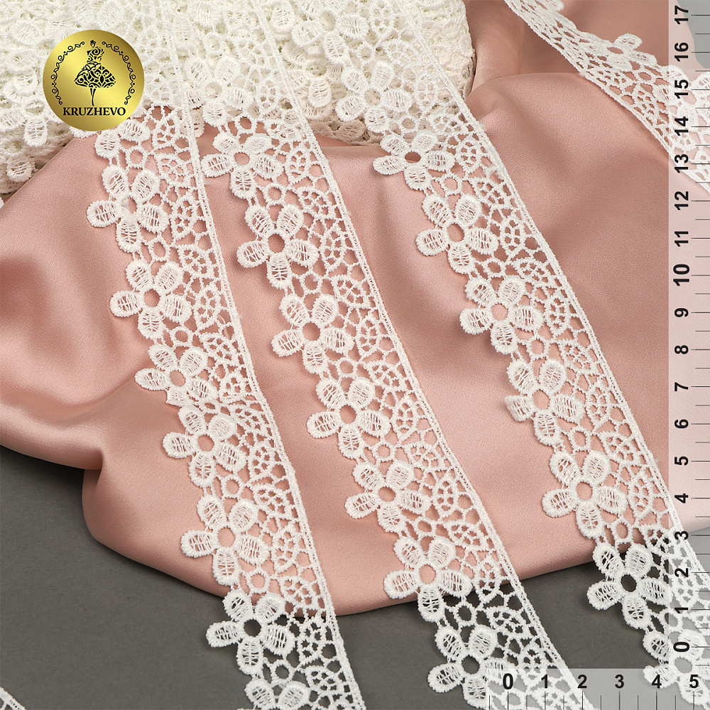 Легкое, ажурное кружево гипюр. Мягкое, но при этом очень прочное за счет полиэстеровых нитей. Имеет благородный блеск. Хорошо держит форму. Широкая область применения: начиная от одежды и свадебных нарядов, заканчивая декором интерьера.