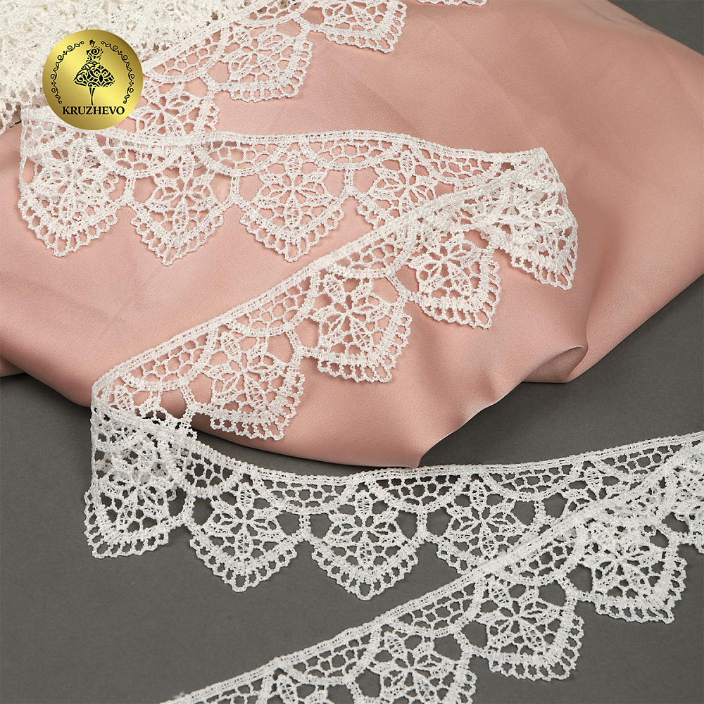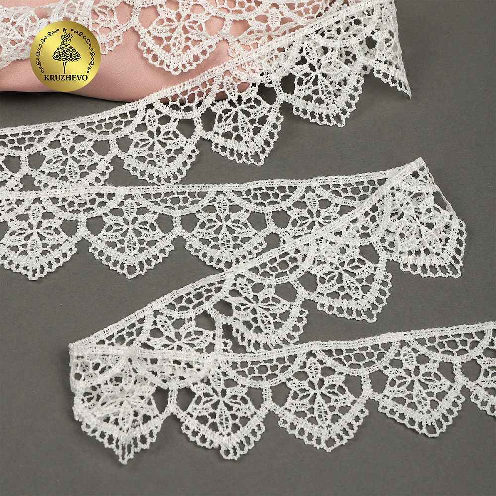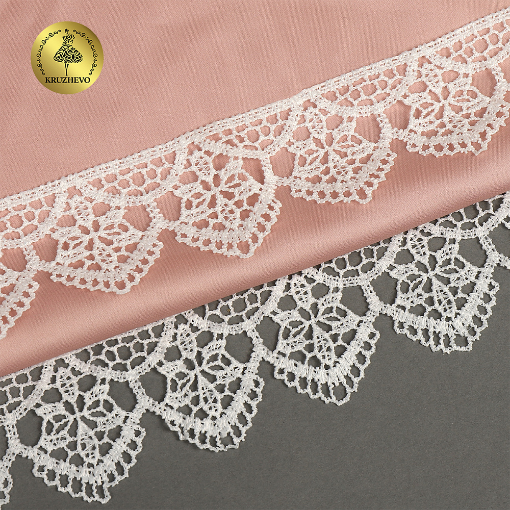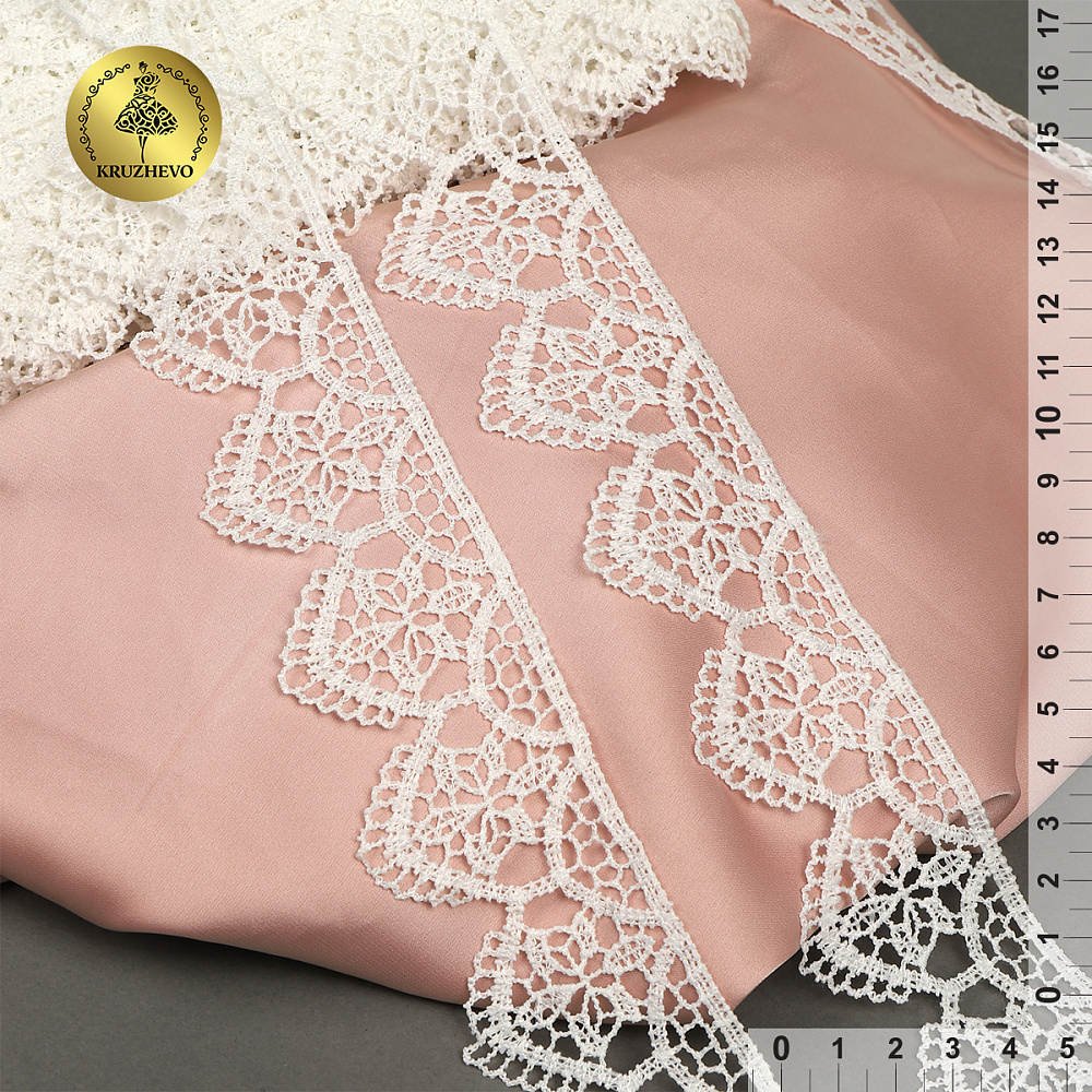 Легкое, ажурное кружево гипюр. Мягкое, но при этом очень прочное за счет полиэстеровых нитей. Имеет благородный блеск. Хорошо держит форму. Широкая область применения: начиная от одежды и свадебных нарядов, заканчивая декором интерьера.