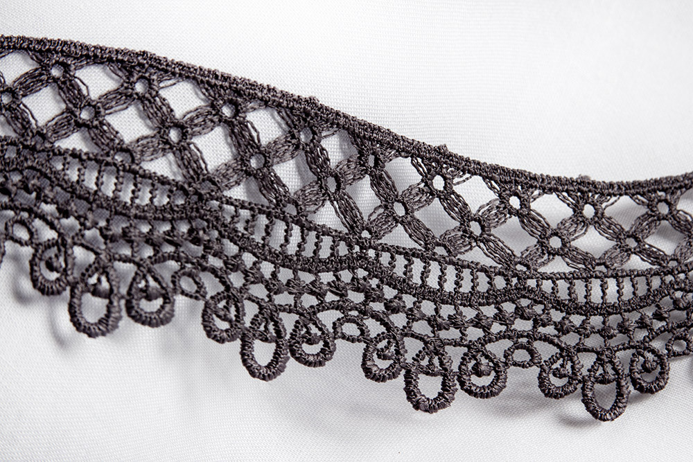 Кружево гипюр состоит из выпуклых кружевных элементов, соединенных сетчатыми "связками". Кружево гипюр имеет ажурное плетение, что придает ему особый изыск. применяется не только для декоративной отделки женской одежды и домашнего текстиля, но и в декоре интерьера.