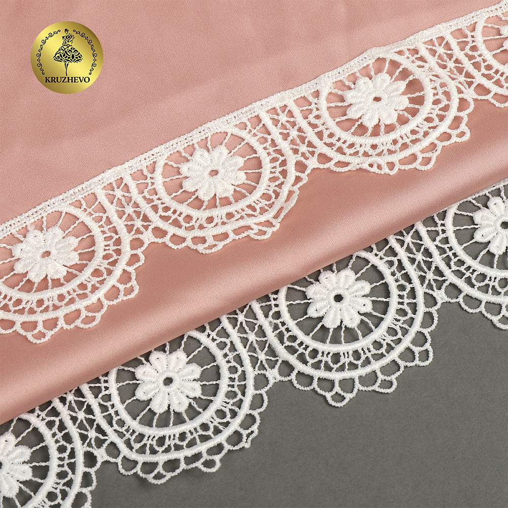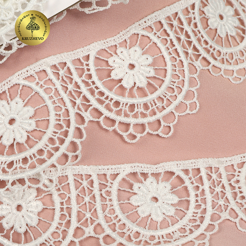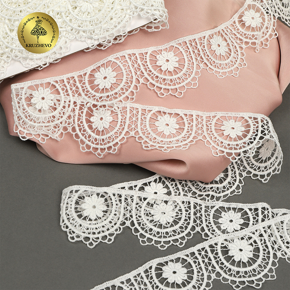 Легкое, ажурное кружево гипюр. Мягкое, но при этом очень прочное за счет полиэстеровых нитей. Имеет благородный блеск. Хорошо держит форму. Широкая область применения: начиная от одежды и свадебных нарядов, заканчивая декором интерьера.