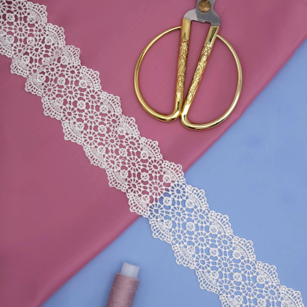 Гипюр – сцепной вид кружева, его легко узнать по слегка объемным элементам, соединенным тонкими сетчатыми связками. Изготовлено из полиэстеровых нитей. Гипюр принято использовать отделки праздничной одежды, а также домашнего текстиля – штор, скатертей, накидок. Матовое кружево удачно сочетается различными видами тканей: атласом, сатином, бархатом, тонким трикотажем. Размер: ширина 5,5 см, длина 13,7 м. Рекомендации по уходу: стирать в специальном мешочке с использованием мягких моющих средств. Температура воды – не более 40 градусов Цельсия. Гладить через влажную ткань при температуре до 150 градусов Цельсия.