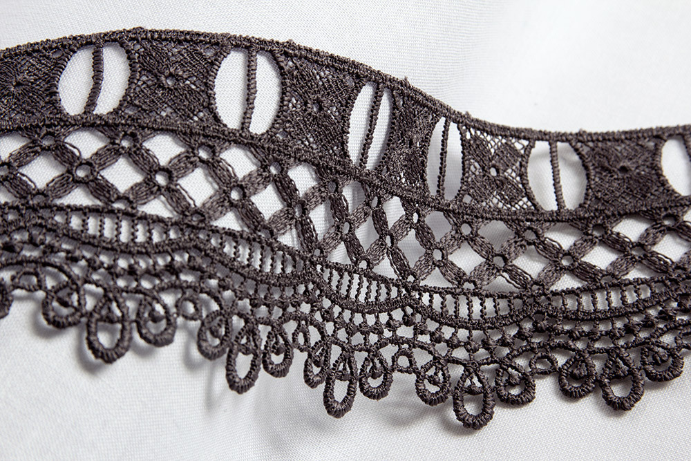 Кружево гипюр состоит из выпуклых кружевных элементов, соединенных сетчатыми "связками". Кружево гипюр имеет ажурное плетение, что придает ему особый изыск. применяется не только для декоративной отделки женской одежды и домашнего текстиля, но и в декоре интерьера.