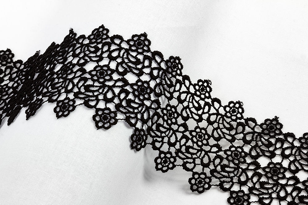 Кружево гипюр состоит из выпуклых кружевных элементов, соединенных сетчатыми "связками". Кружево гипюр имеет ажурное плетение, что придает ему особый изыск. применяется не только для декоративной отделки женской одежды и домашнего текстиля, но и в декоре интерьера.