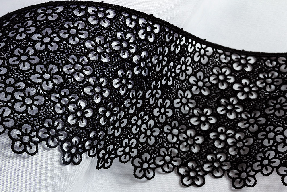 Кружево гипюр состоит из выпуклых кружевных элементов, соединенных сетчатыми "связками". Кружево гипюр имеет ажурное плетение, что придает ему особый изыск. применяется не только для декоративной отделки женской одежды и домашнего текстиля, но и в декоре интерьера.
