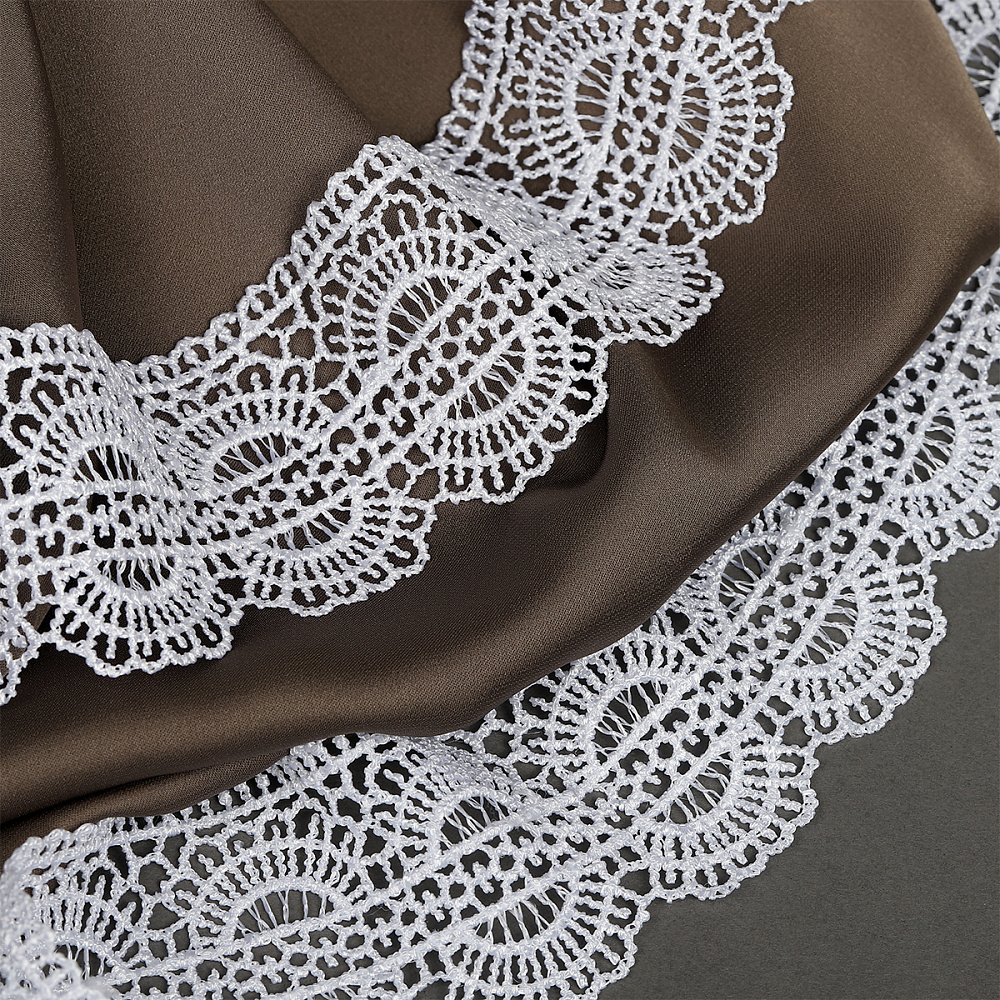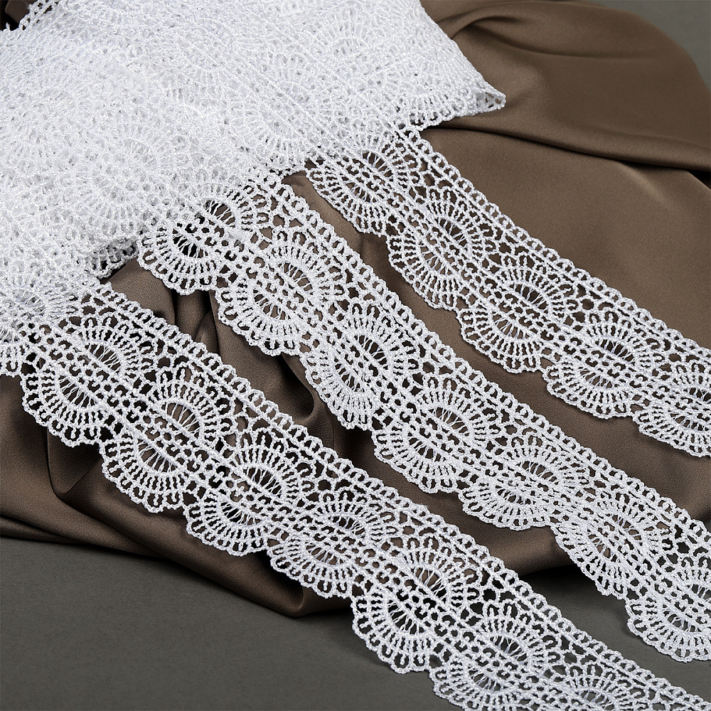 Легкое, ажурное гипюровое кружево. Имеет широкую область применения: начиная от одежды и свадебных нарядов заканчивая декором интерьера.