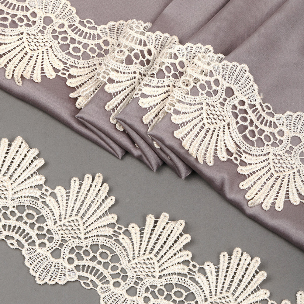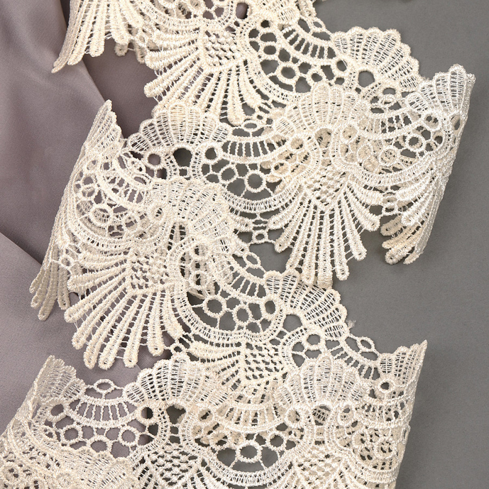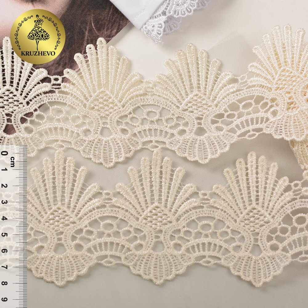 Кружево гипюр шириной 85 мм. с фестонами и ажурным краем бежевого цвета. Очень нежное и красивое. Используется в украшении юбок, платьев, блузок из трикотажа, тонкой драповой ткани. Украсит любую работу в стиле винтаж, шебби. Прекрасное качество кружева заставит заиграть даже простую вещь. Жесткая текстура прекрасно подчеркивает сдержанный матовый блеск.