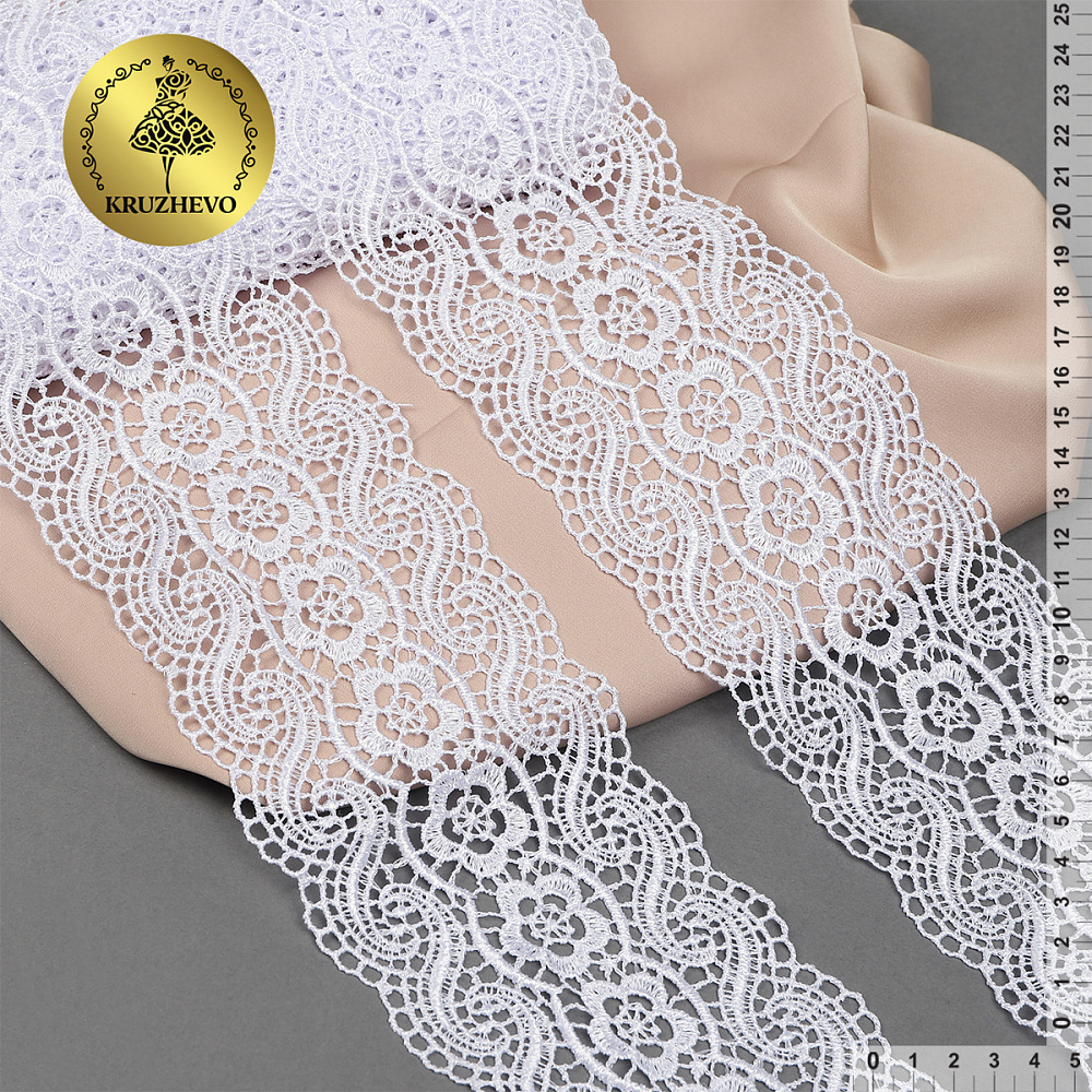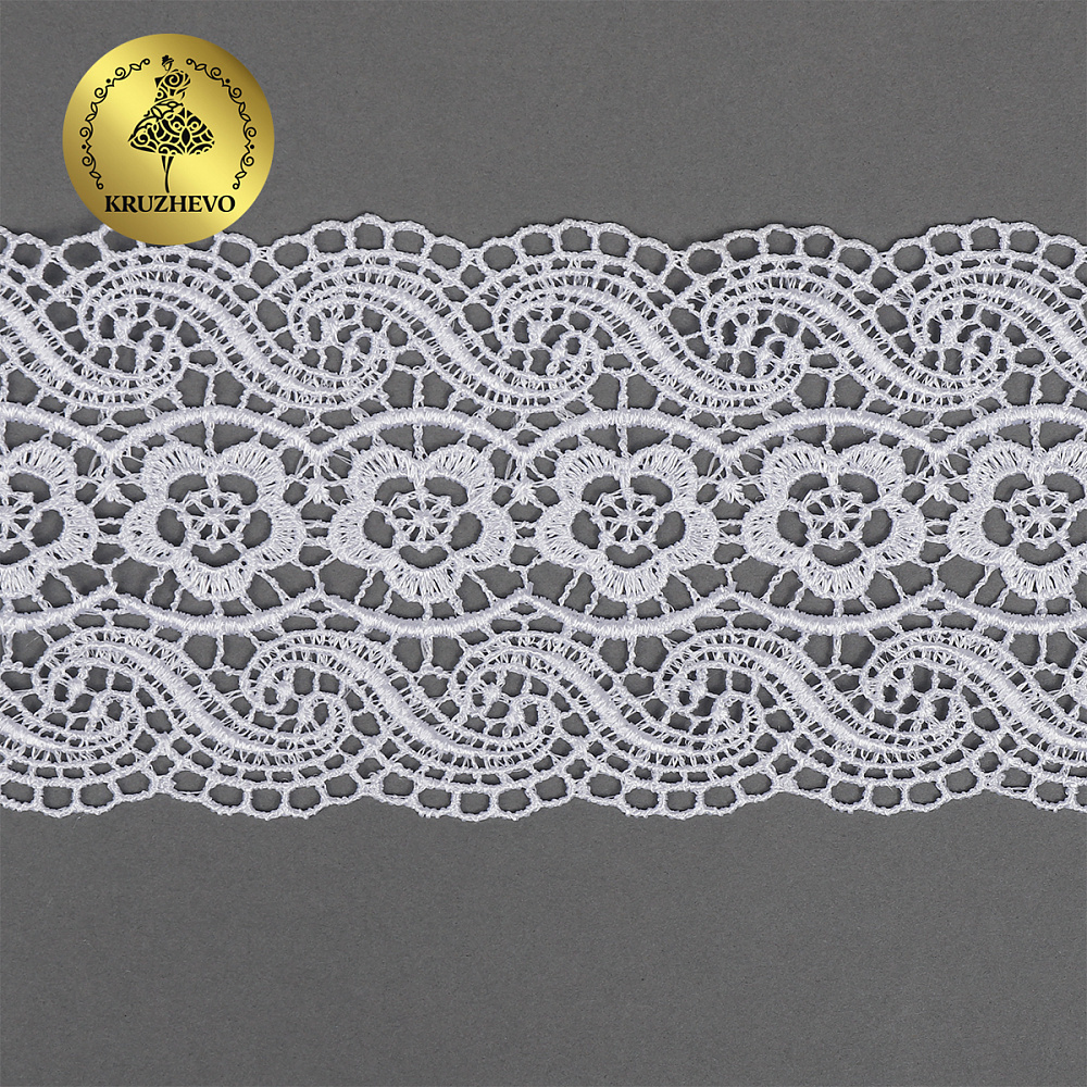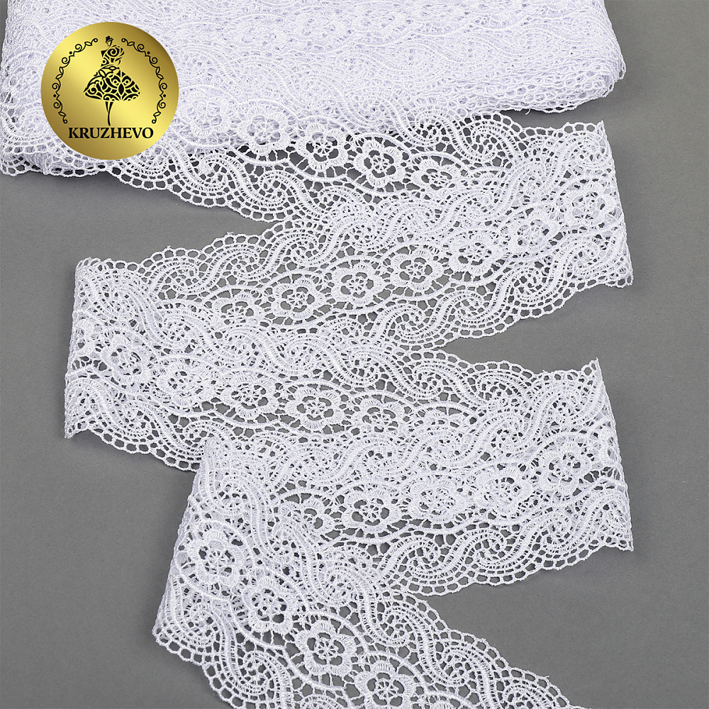 Красивое, ажурное гипюровое кружево. Мягкое, но при этом очень прочное за счет полиэстеровых нитей. Хорошо держит форму. Имеет широкую область применения: начиная от одежды, школьной формы и свадебных нарядов, заканчивая декором интерьера.