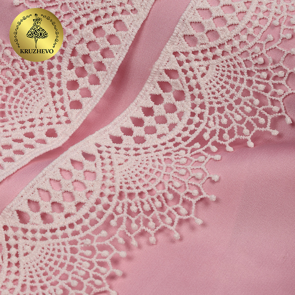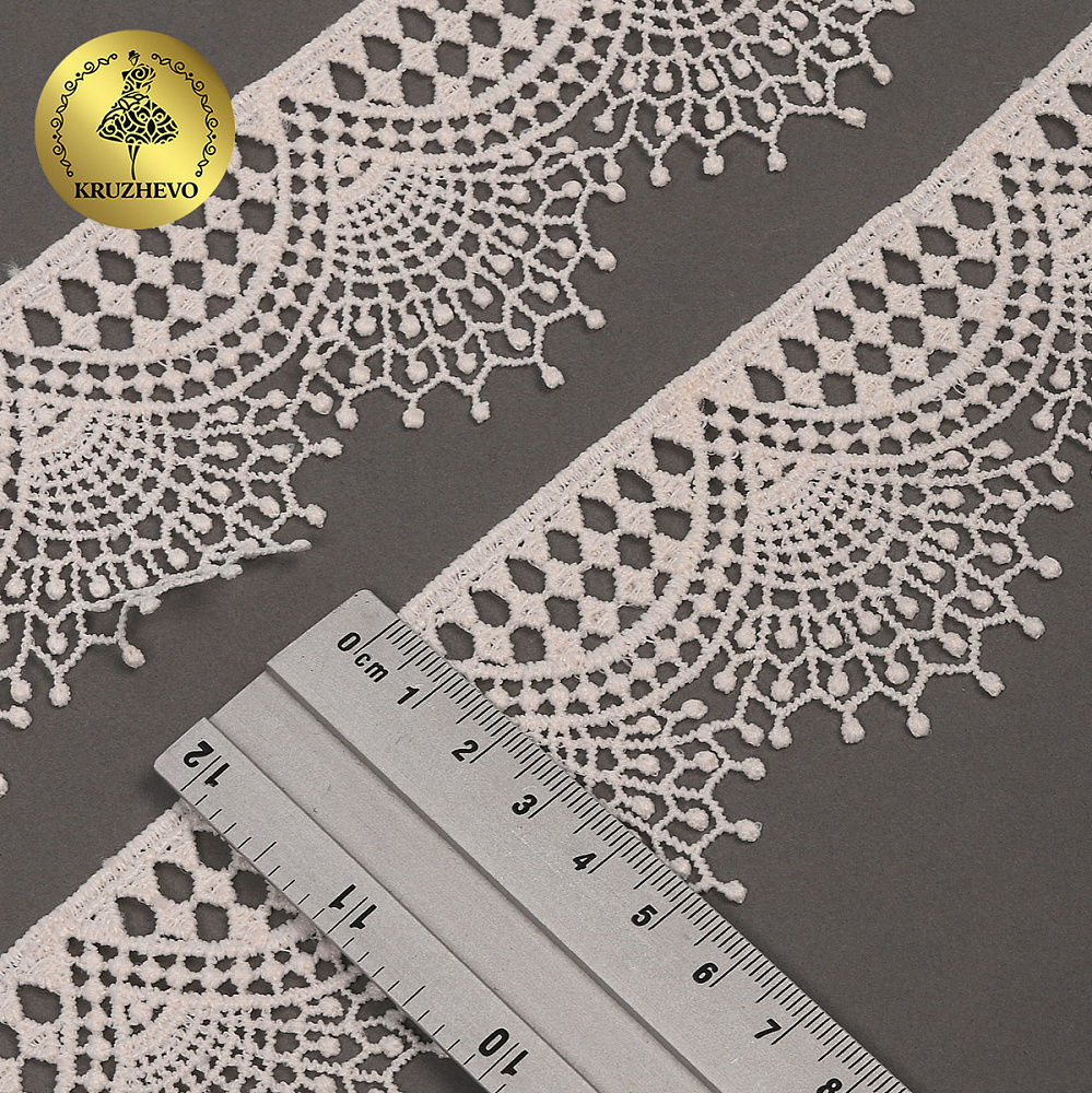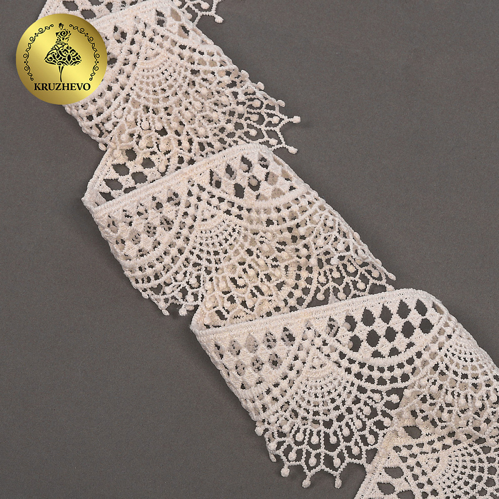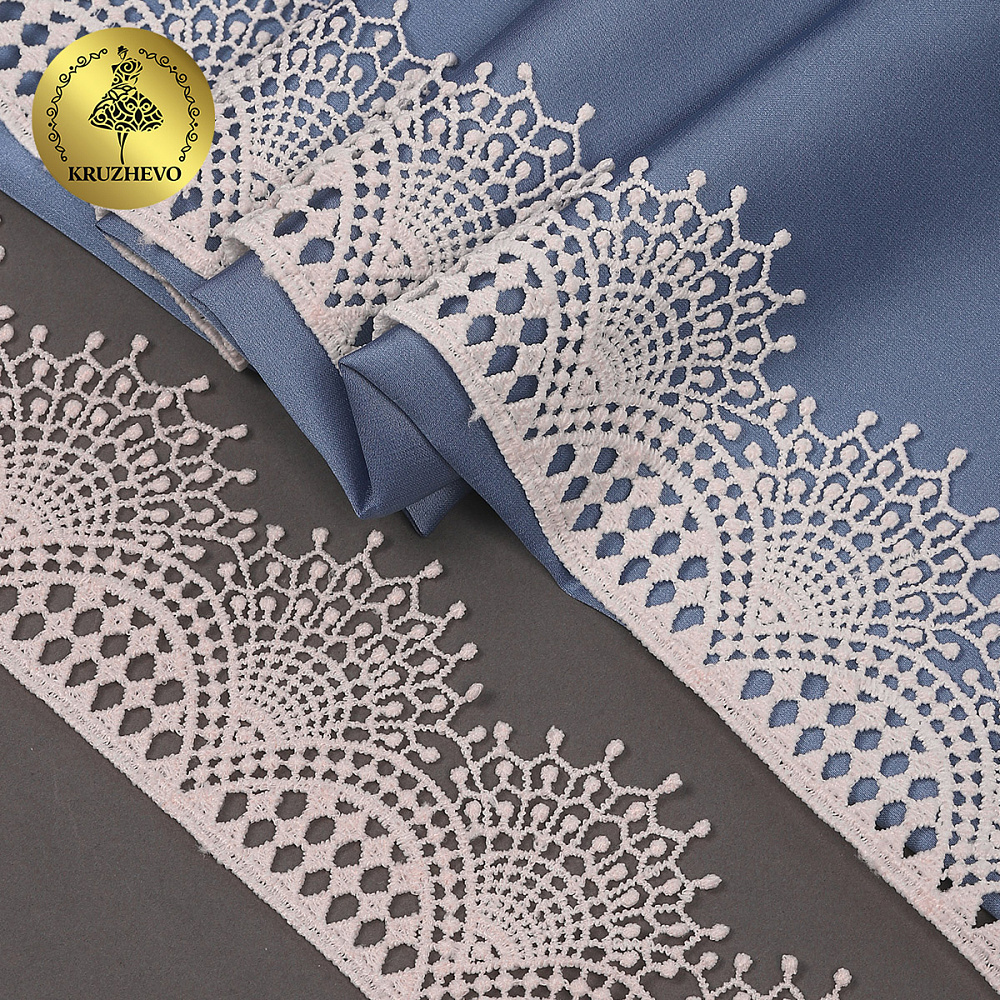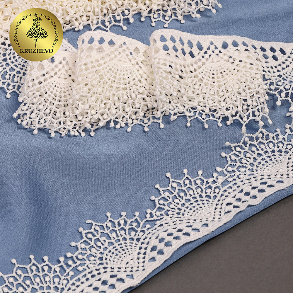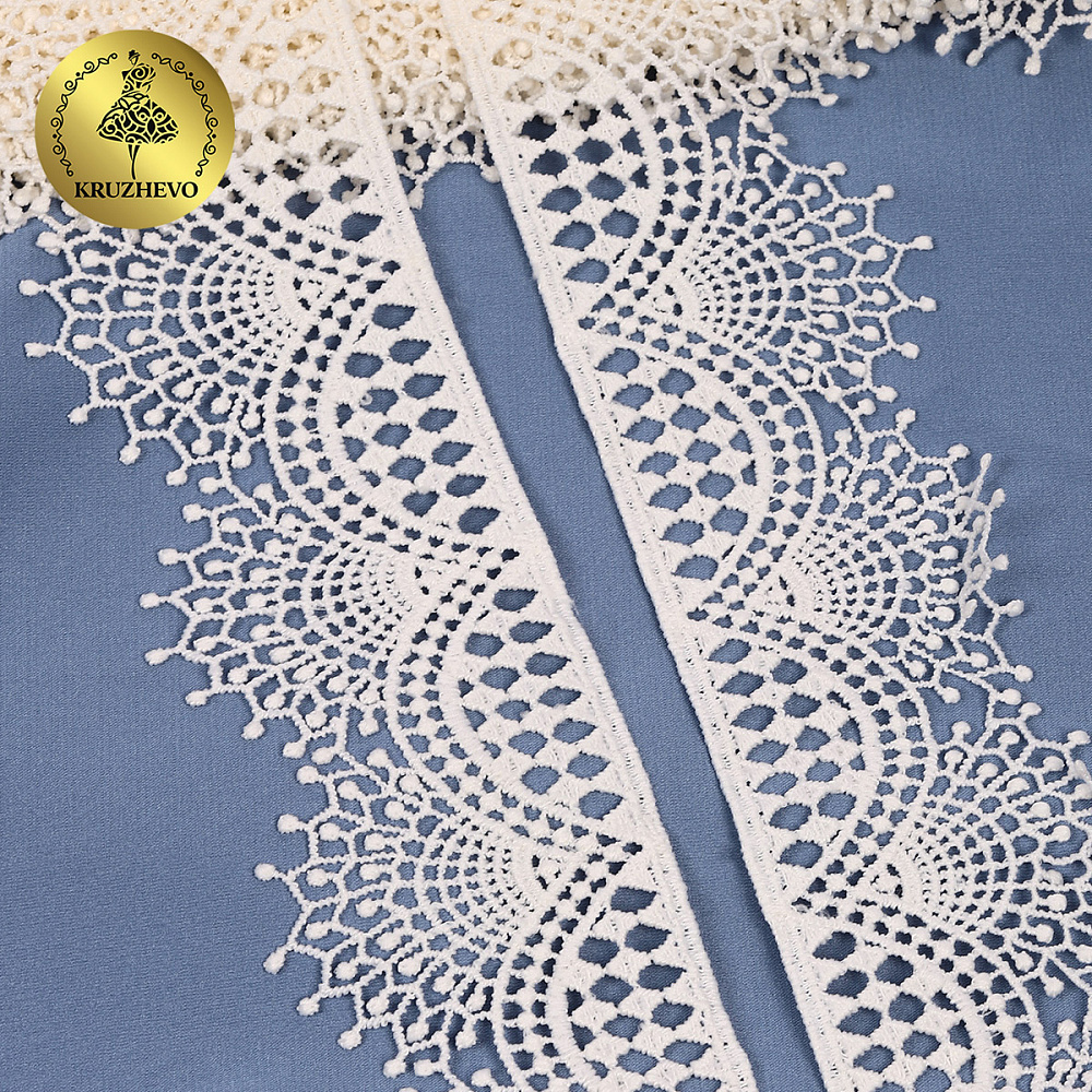 Красивое, ажурное гипюровое кружево от бренда Kruzhevo. Мягкое, но при этом очень прочное за счет полиэстеровых нитей. Хорошо держит форму. Имеет широкую область применения: начиная от одежды, школьной формы и свадебных нарядов, заканчивая декором интерьера.