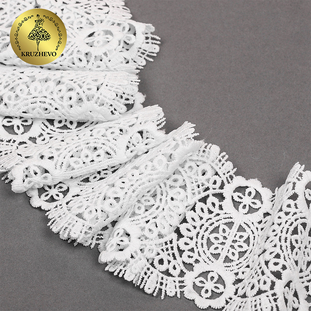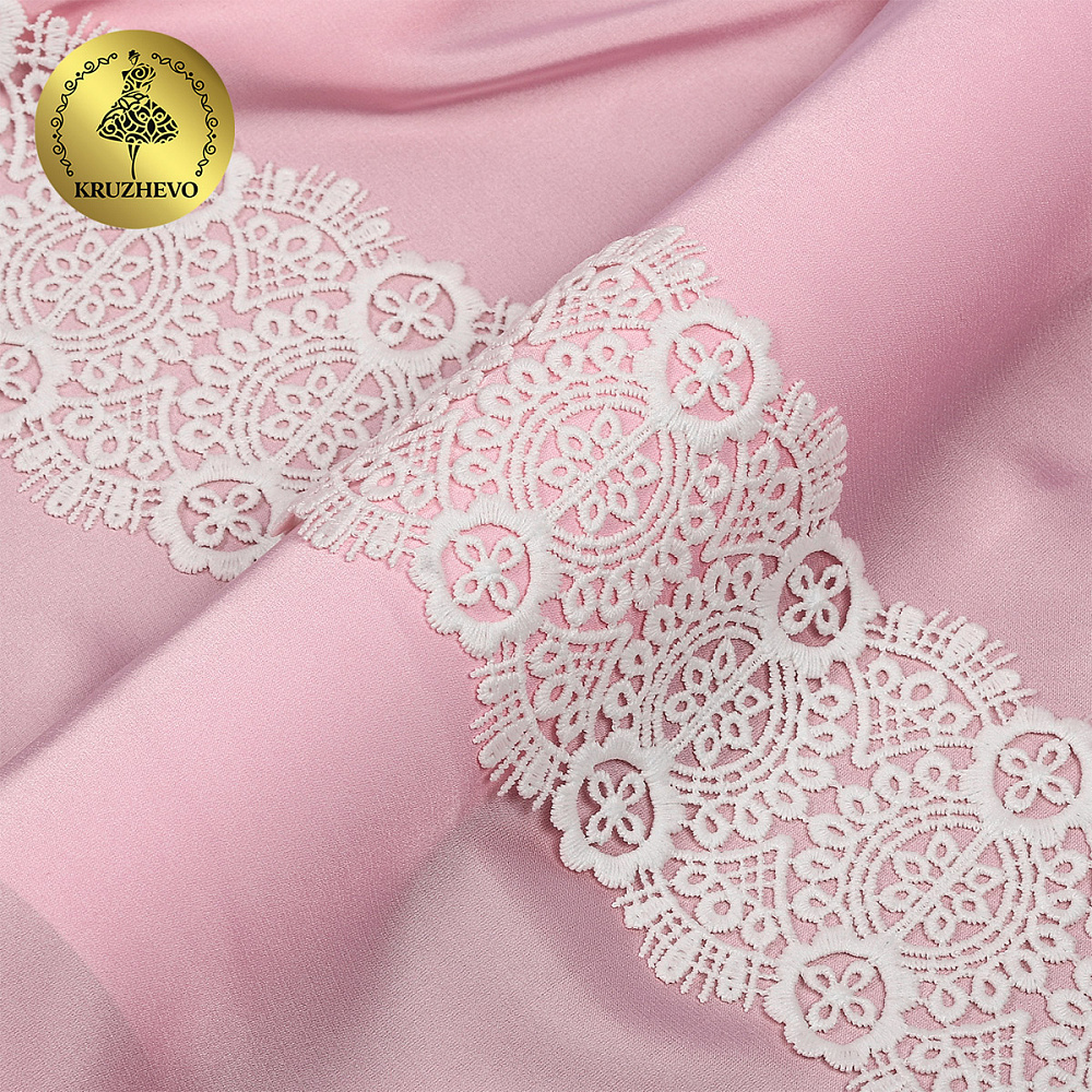 Легкое, ажурное кружево гипюр от бренда Kruzhevo. Мягкое, но при этом очень прочное за счет полиэстеровых нитей. Имеет благородный блеск. Хорошо держит форму. Широкая область применения: начиная от одежды и свадебных нарядов, заканчивая декором интерьера.