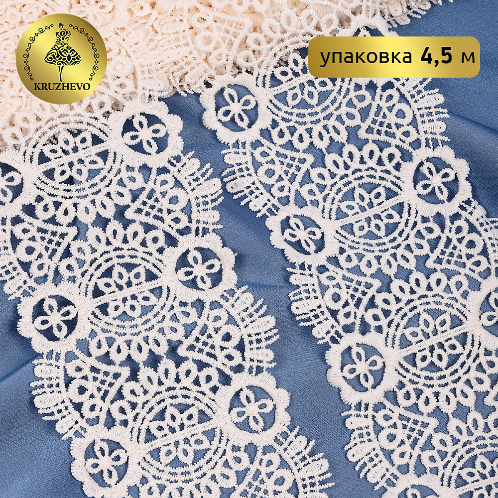 Легкое, ажурное кружево гипюр от бренда Kruzhevo. Мягкое, но при этом очень прочное за счет полиэстеровых нитей. Имеет благородный блеск. Хорошо держит форму. Широкая область применения: начиная от одежды и свадебных нарядов, заканчивая декором интерьера.