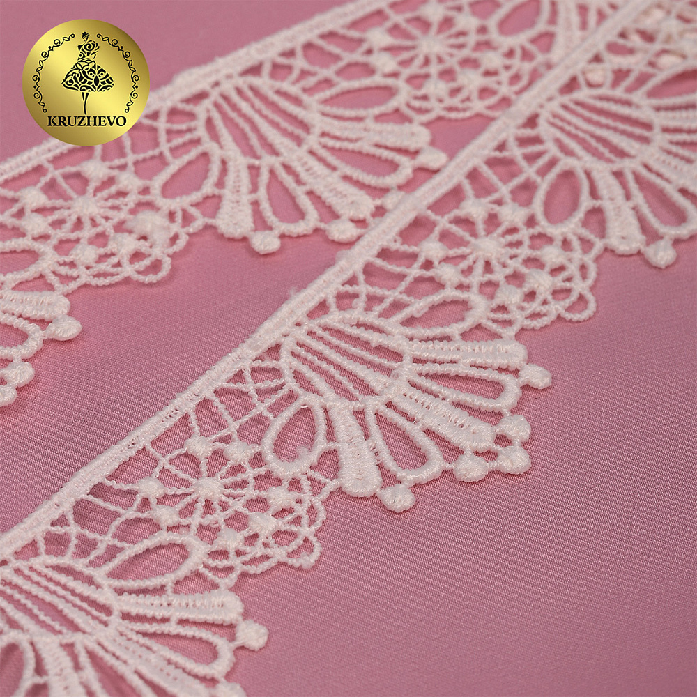 Красивое, ажурное гипюровое кружево от бренда Kruzhevo. Мягкое, но при этом очень прочное за счет полиэстеровых нитей. Хорошо держит форму. Имеет широкую область применения: начиная от одежды, школьной формы и свадебных нарядов, заканчивая декором интерьера.