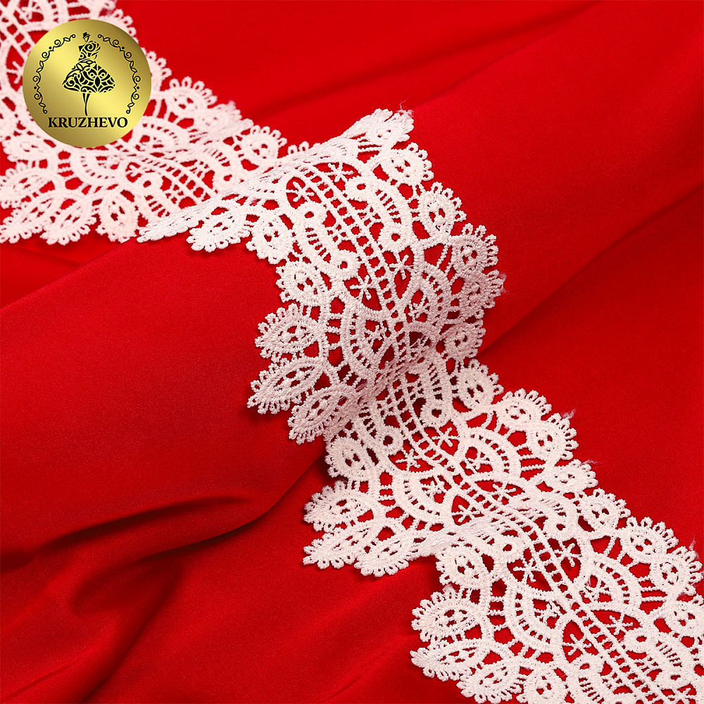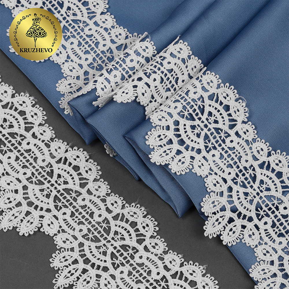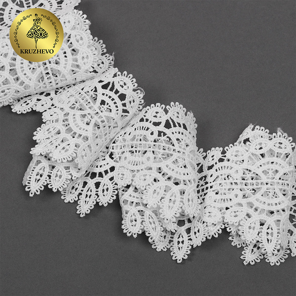 Красивое, ажурное гипюровое кружево от бренда Kruzhevo. Мягкое, но при этом очень прочное за счет полиэстеровых нитей. Хорошо держит форму. Имеет широкую область применения: начиная от одежды, школьной формы и свадебных нарядов, заканчивая декором интерьера.