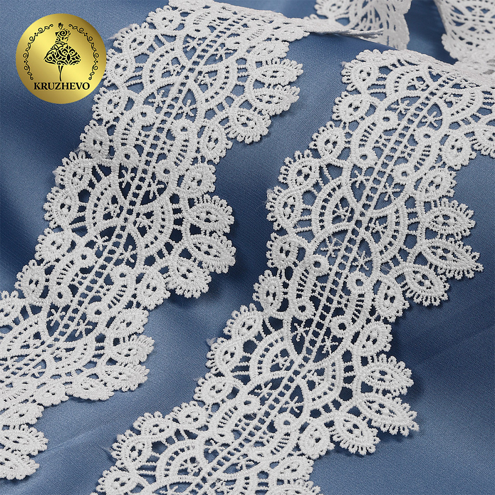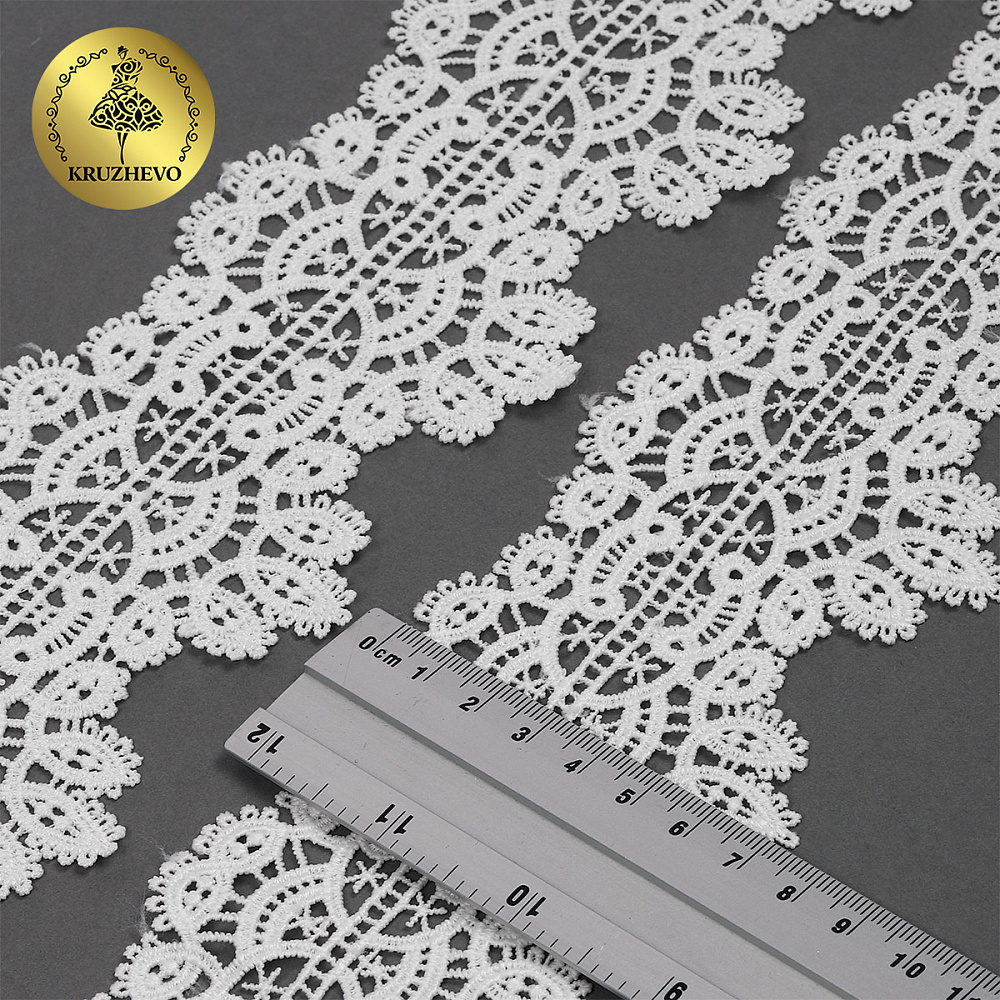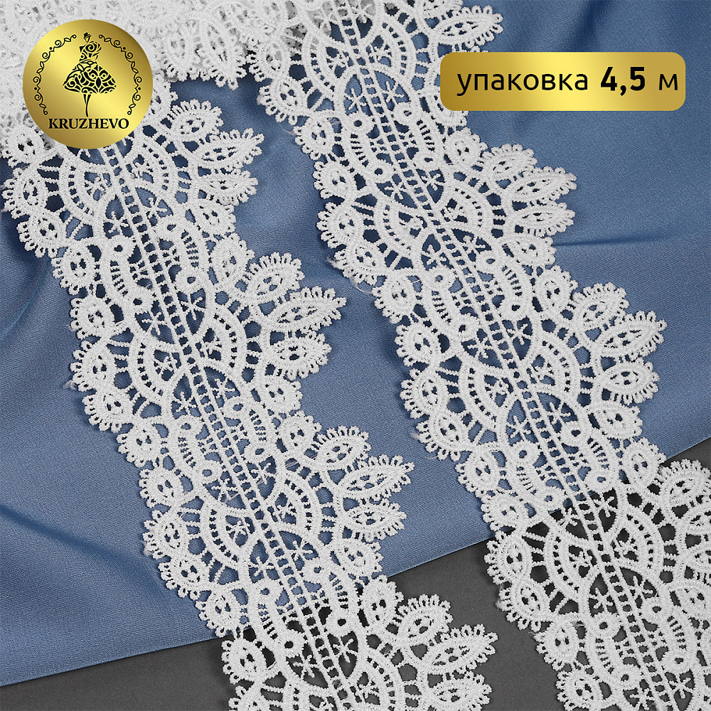 Легкое, ажурное кружево гипюр от бренда Kruzhevo. Мягкое, но при этом очень прочное за счет полиэстеровых нитей. Имеет благородный блеск. Хорошо держит форму. Широкая область применения: начиная от одежды и свадебных нарядов, заканчивая декором интерьера.